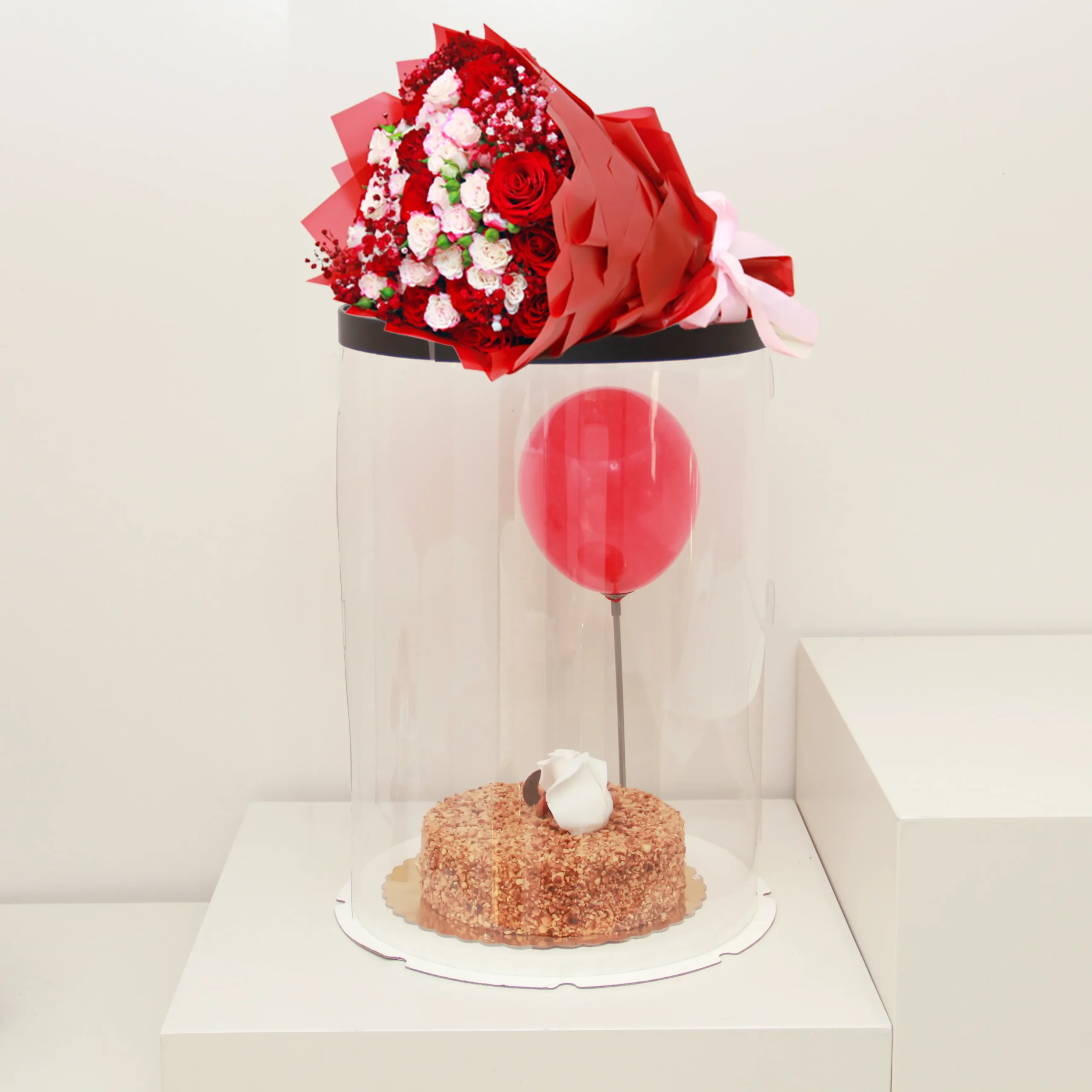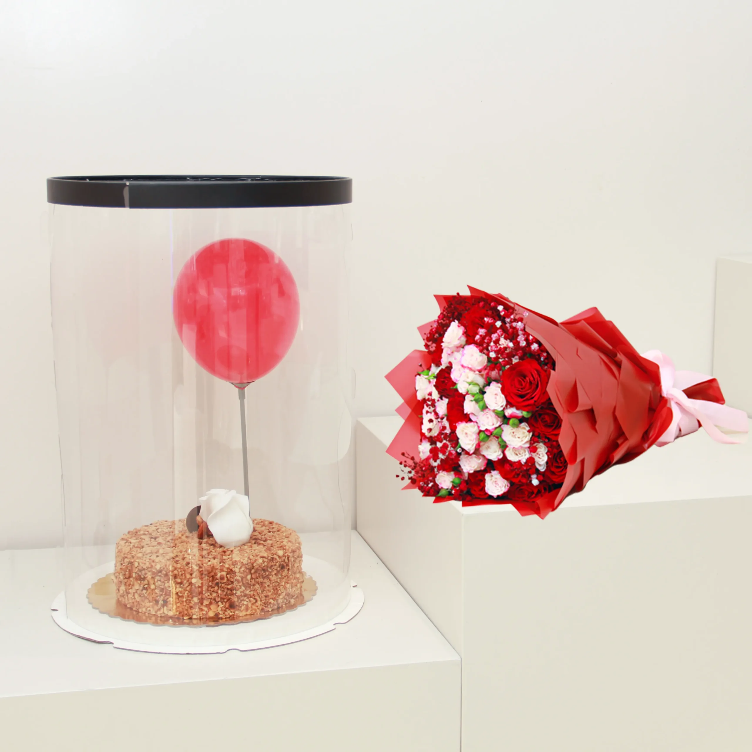 This exquisite arrangement features a harmonious blend of a mix roses bouquet, a Hazelnut Cake, and a beautiful balloon. This exclusive combination is a celebration of flavors and floral elegance, making it an ideal gift for any occasion. Elevate your gifting experience and share the joy of this delightful ensemble with someone special.