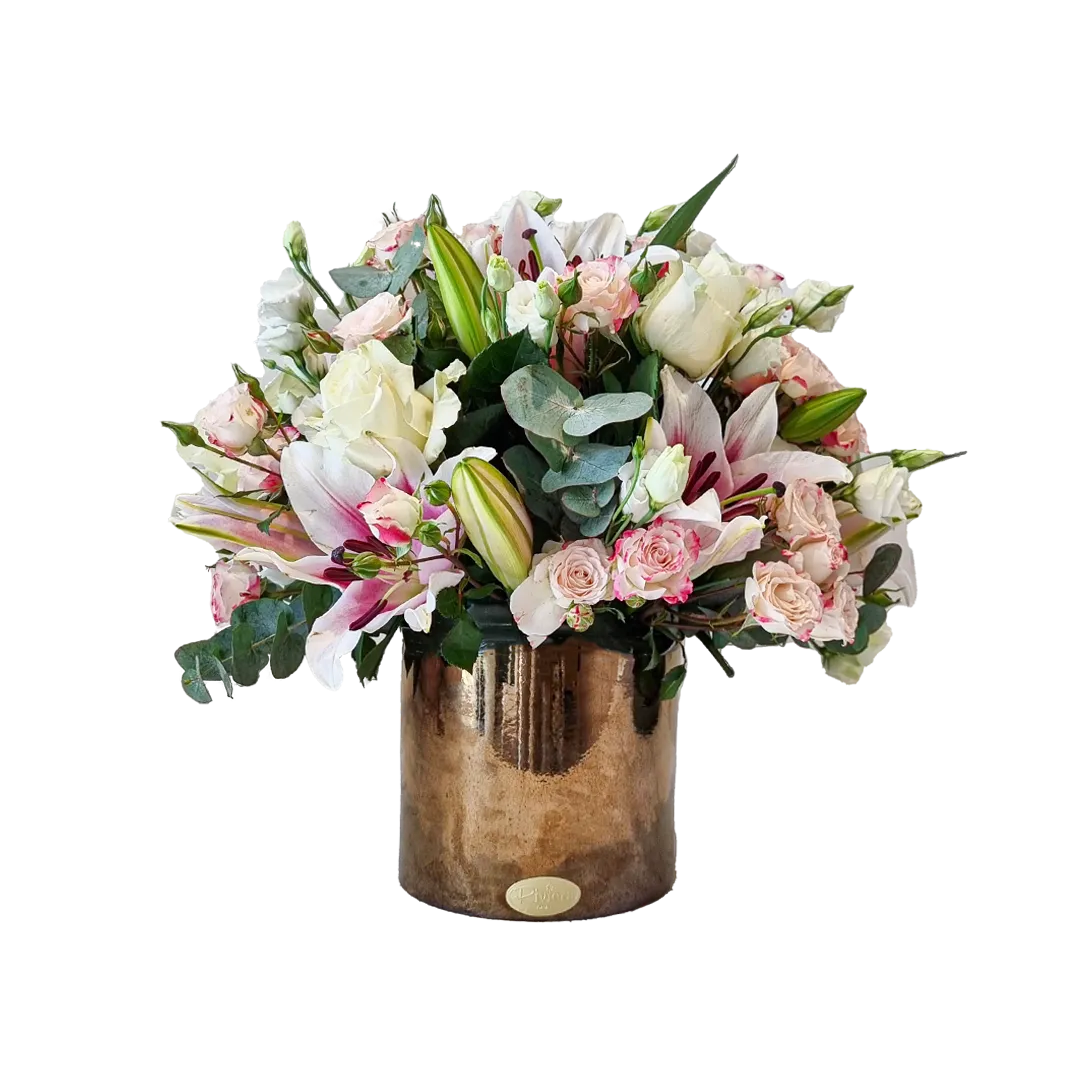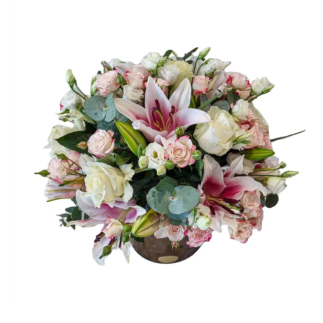 A beautiful arrangement full of mixed white, green, and pink flowers is beautifully arranged in a ceramic vase.