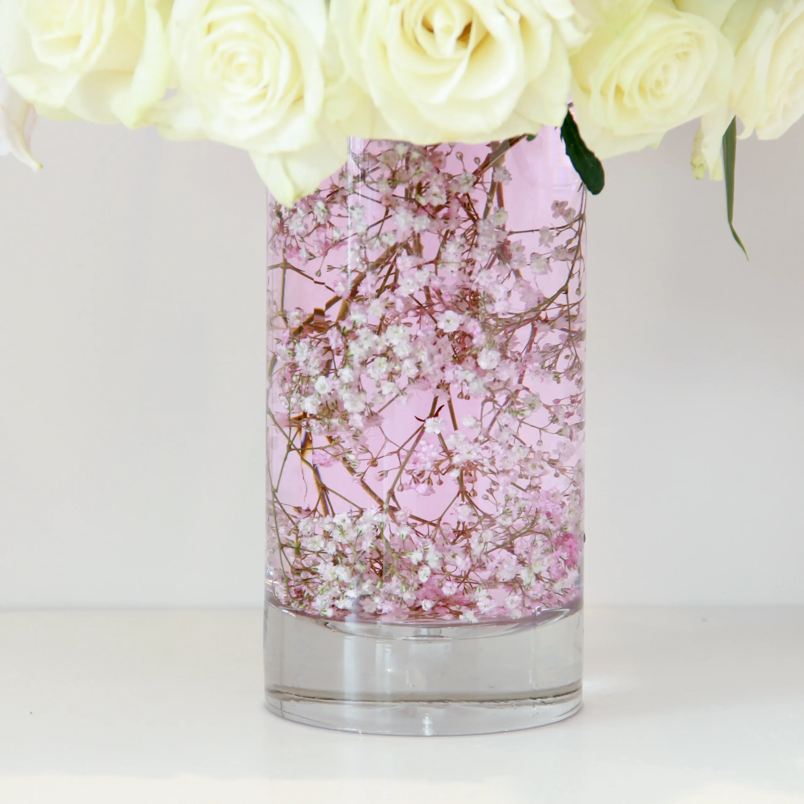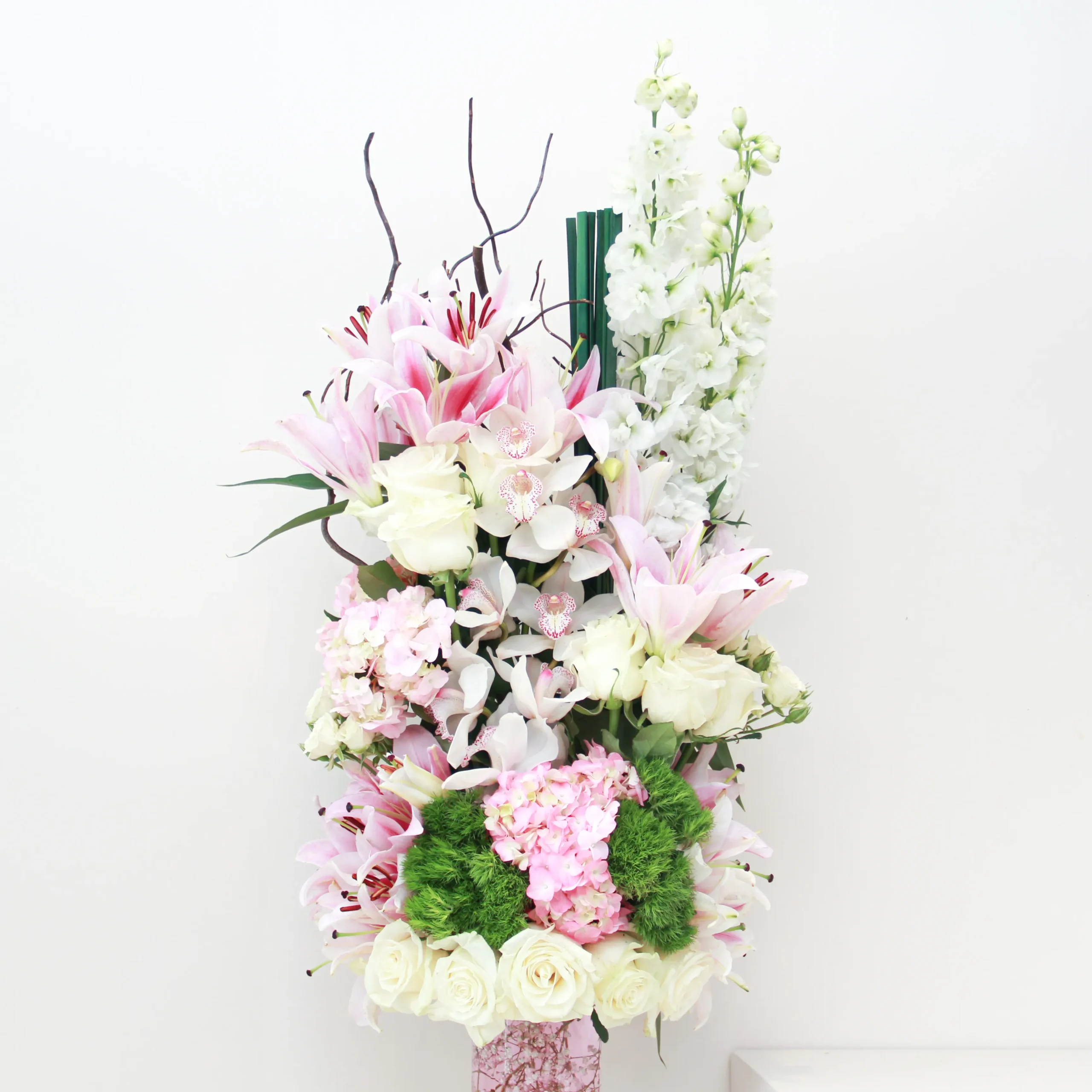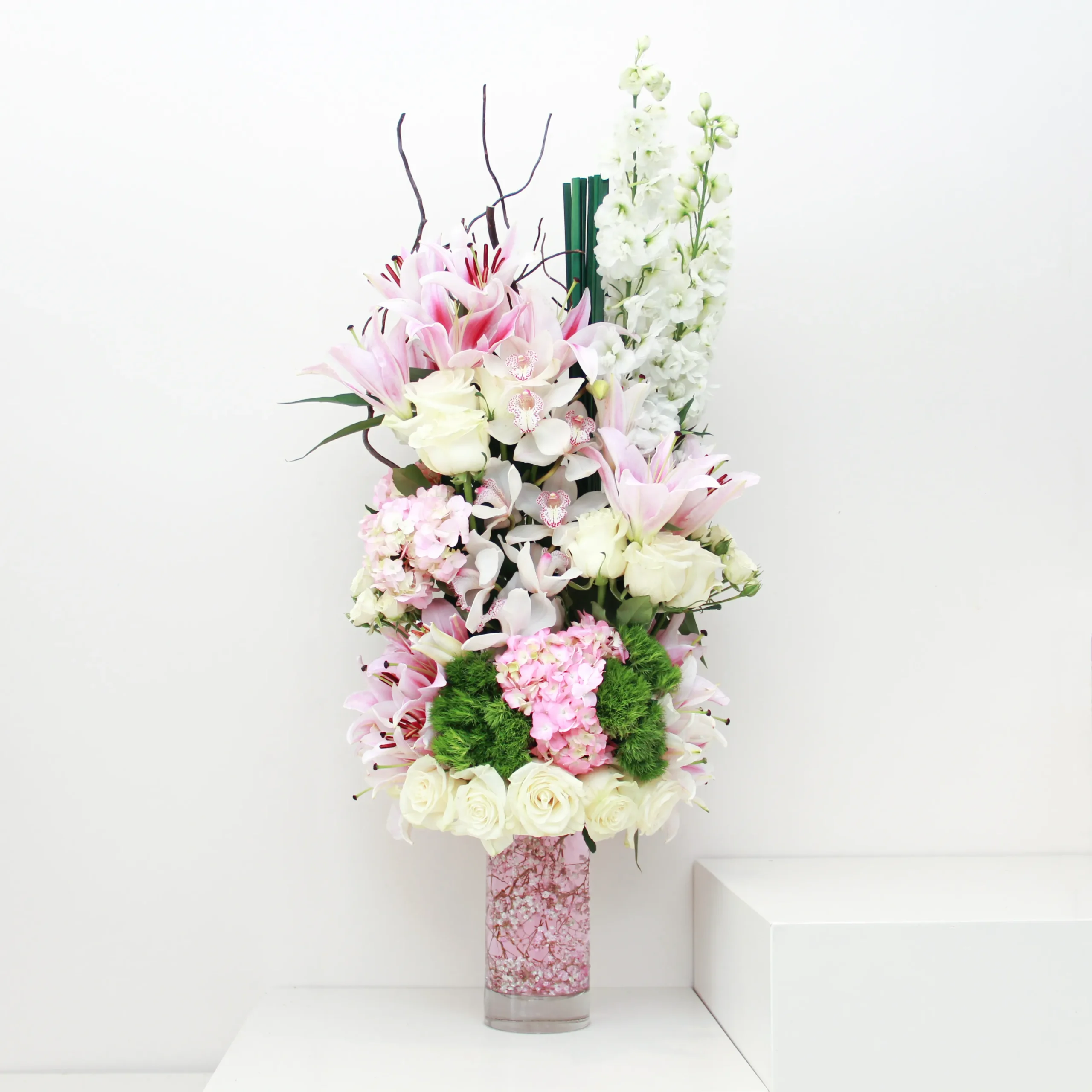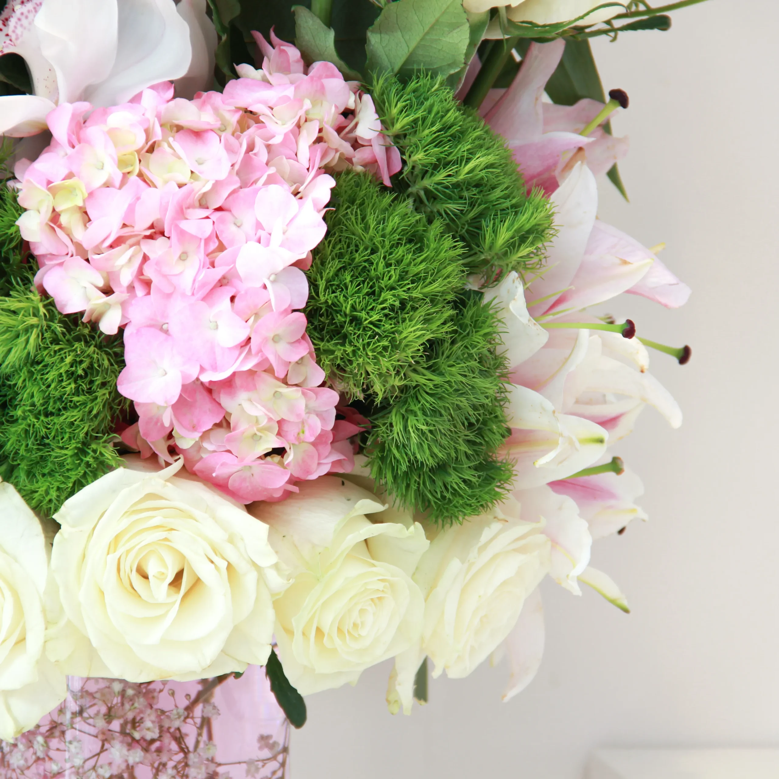 A stunning blend of pink, white, and green blooms beautifully arranged in a clear glass vase — this elegant floral piece radiates freshness, grace, and charm. Perfect for brightening any space or gifting someone special, it adds a touch of natural sophistication to your decor.