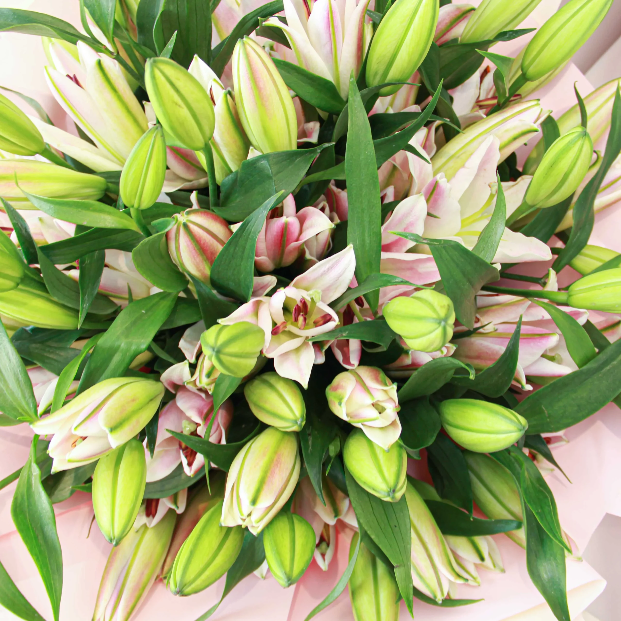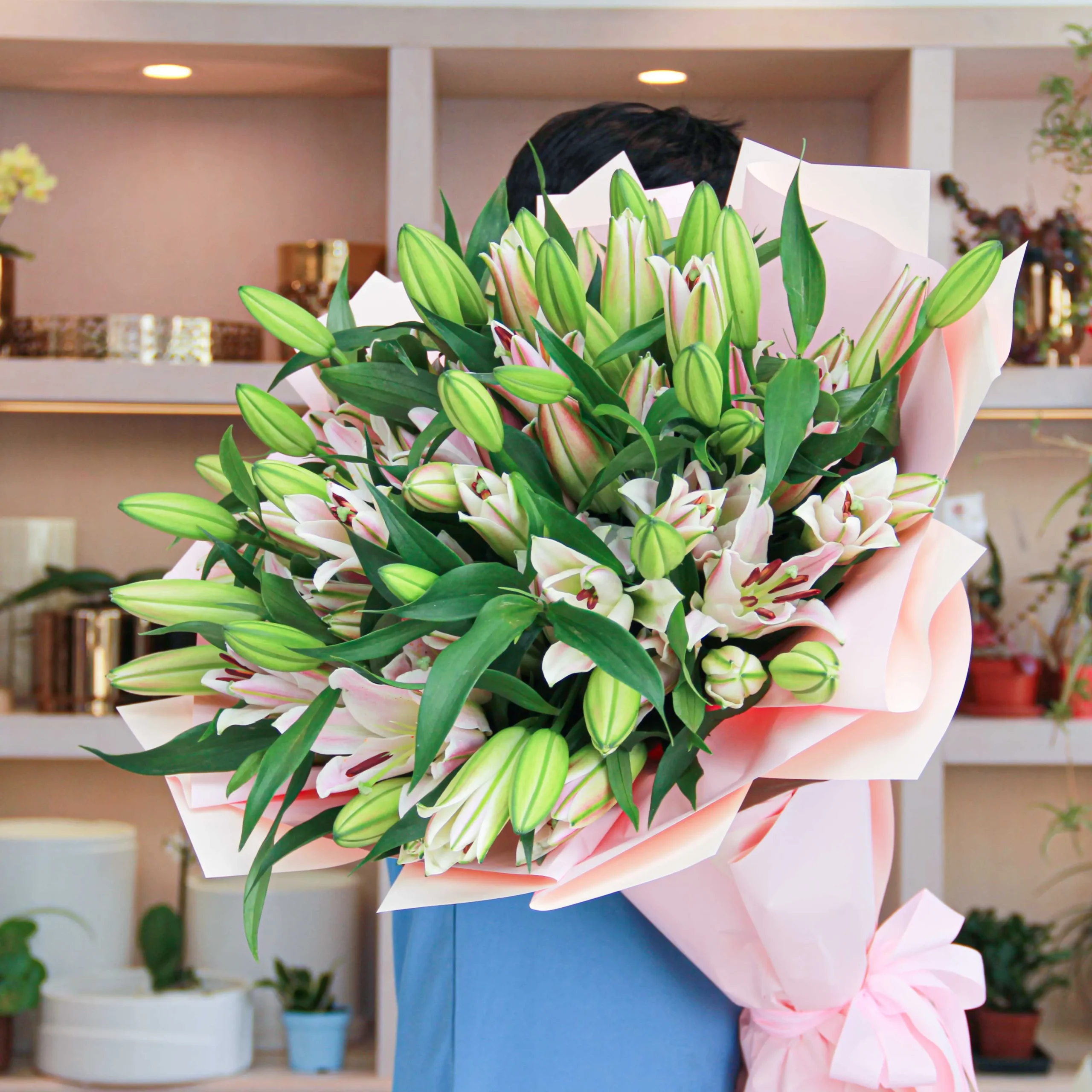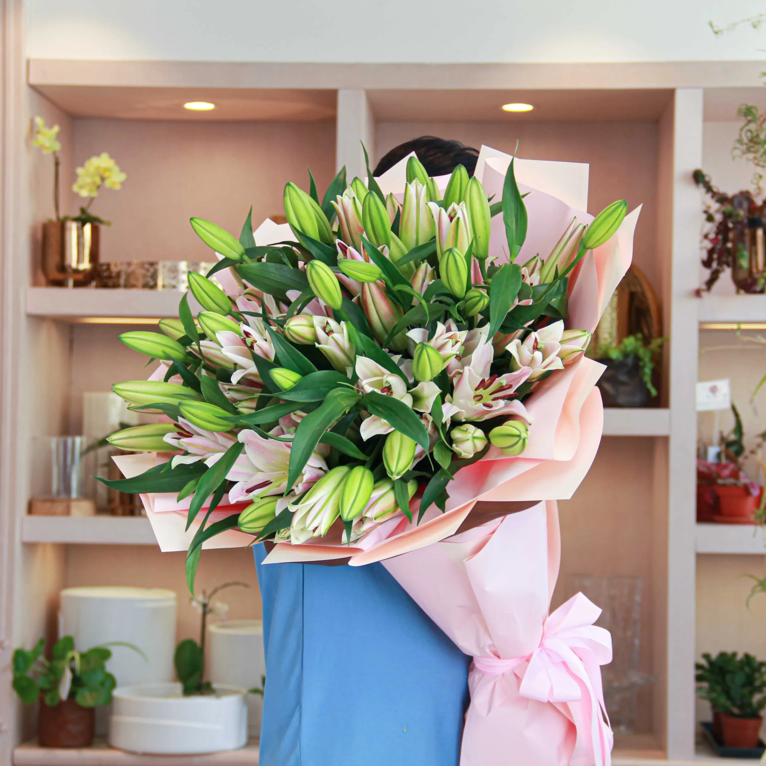 An extra-special person deserves a very special gift, just like this beautiful hand-tied bouquet. A beautiful bouquet of pink lilies is wrapped in plastic paper. It is a classic big bouquet that is adored by everyone.