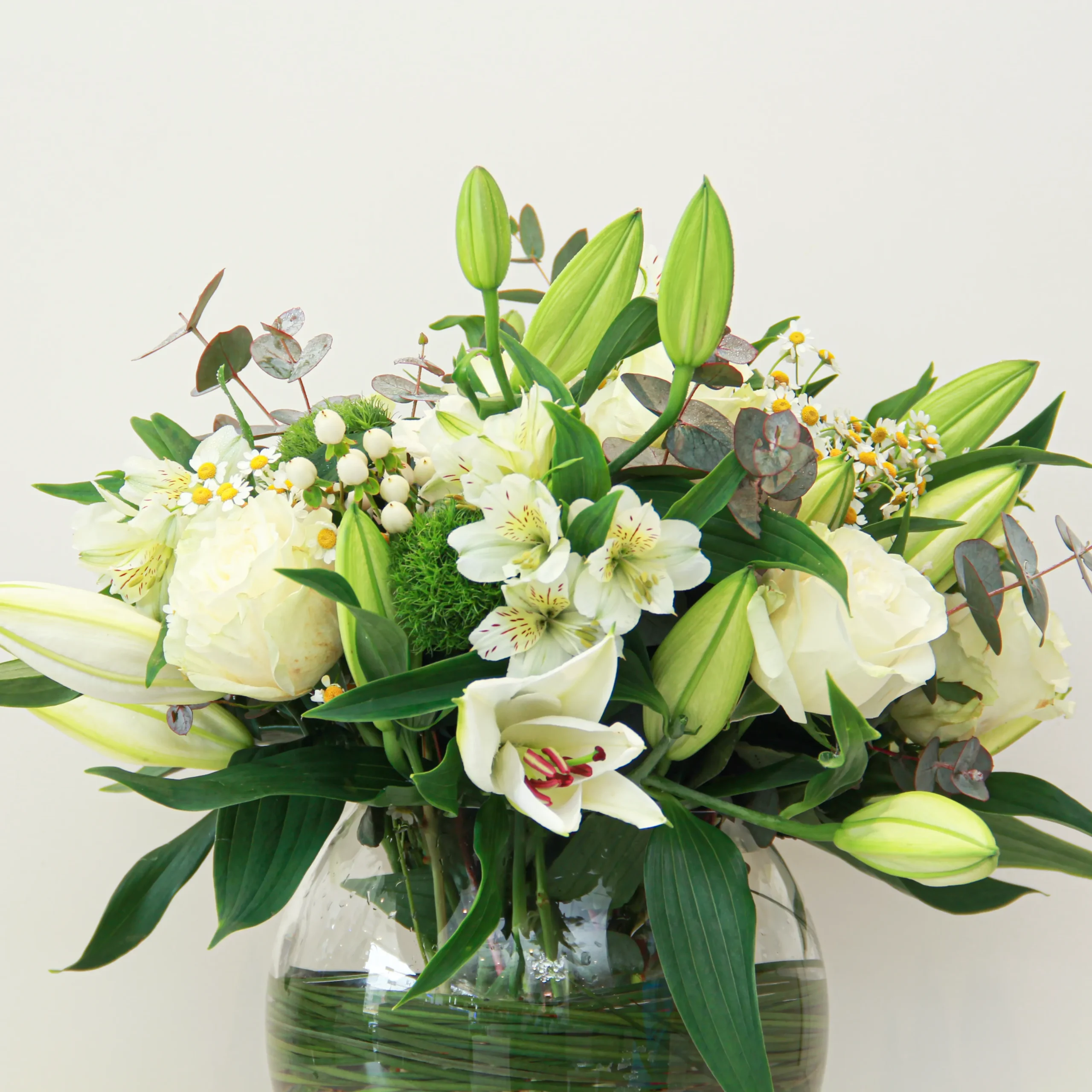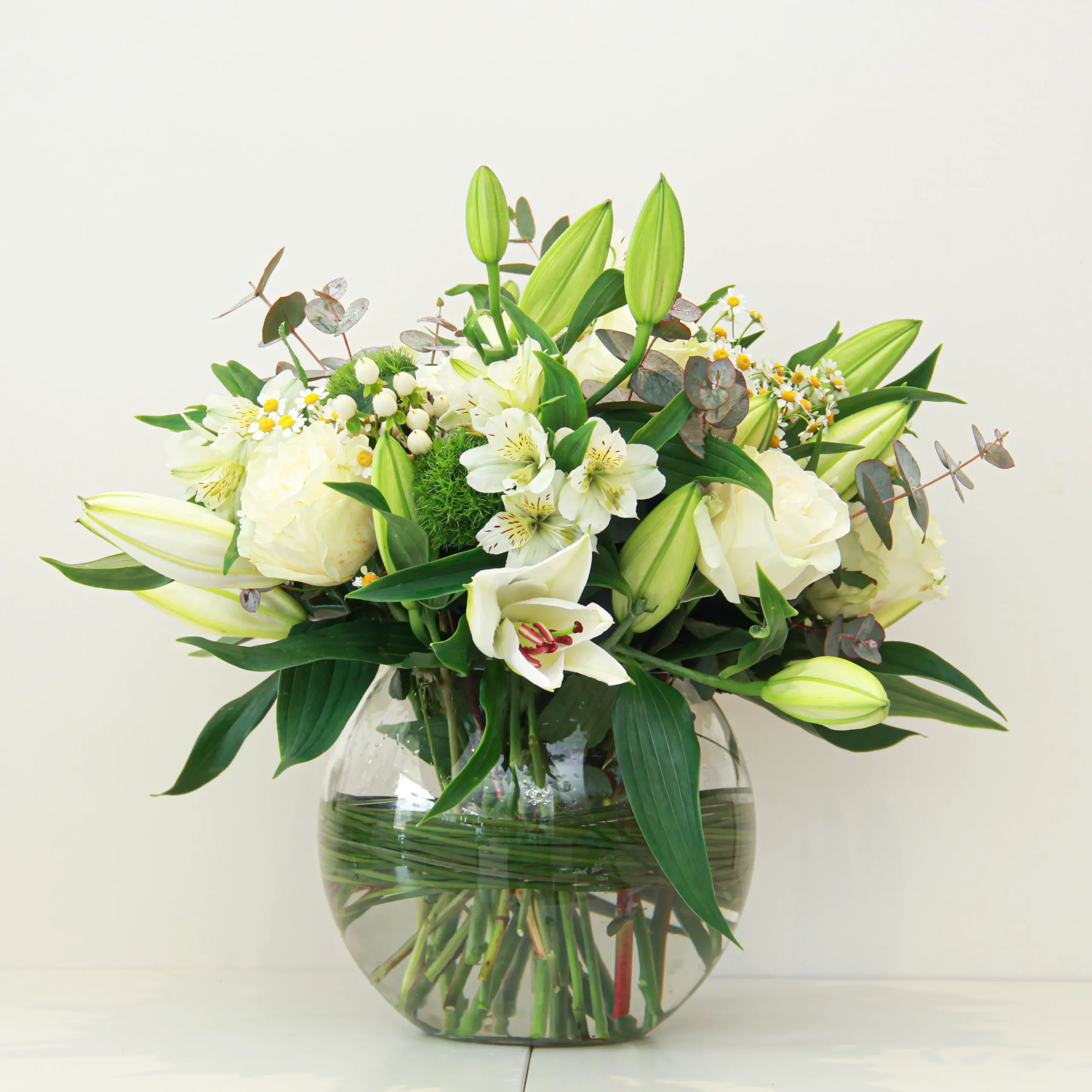 Carefully curated with only the most luxurious blooms. The arrangement boasts a harmonious blend of classic white and green flowers, elegantly accented with fresh greenery.