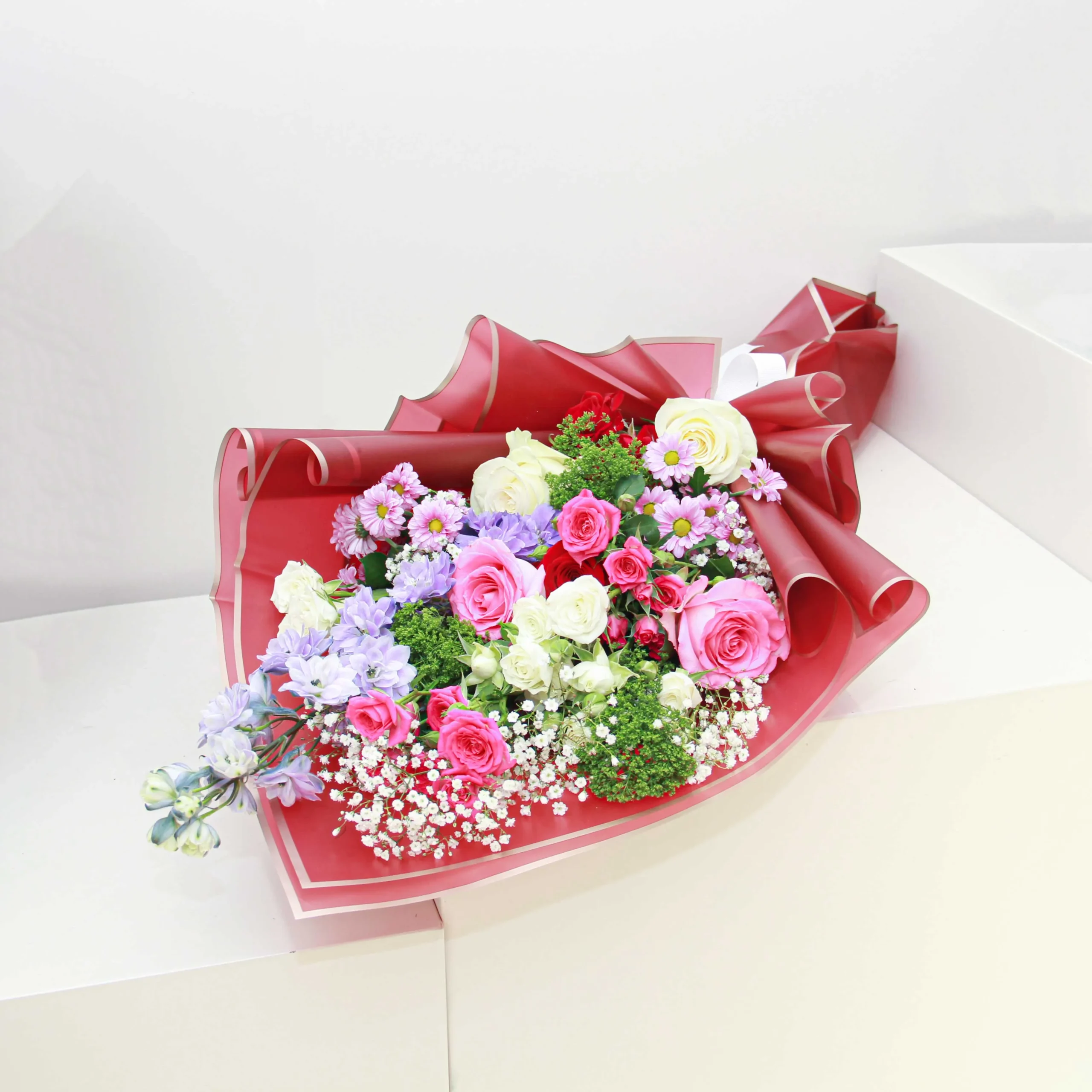 A mix of bright pink, red, purple, green, and white roses will send a huge smile across a loved one’s face when they receive this bouquet.