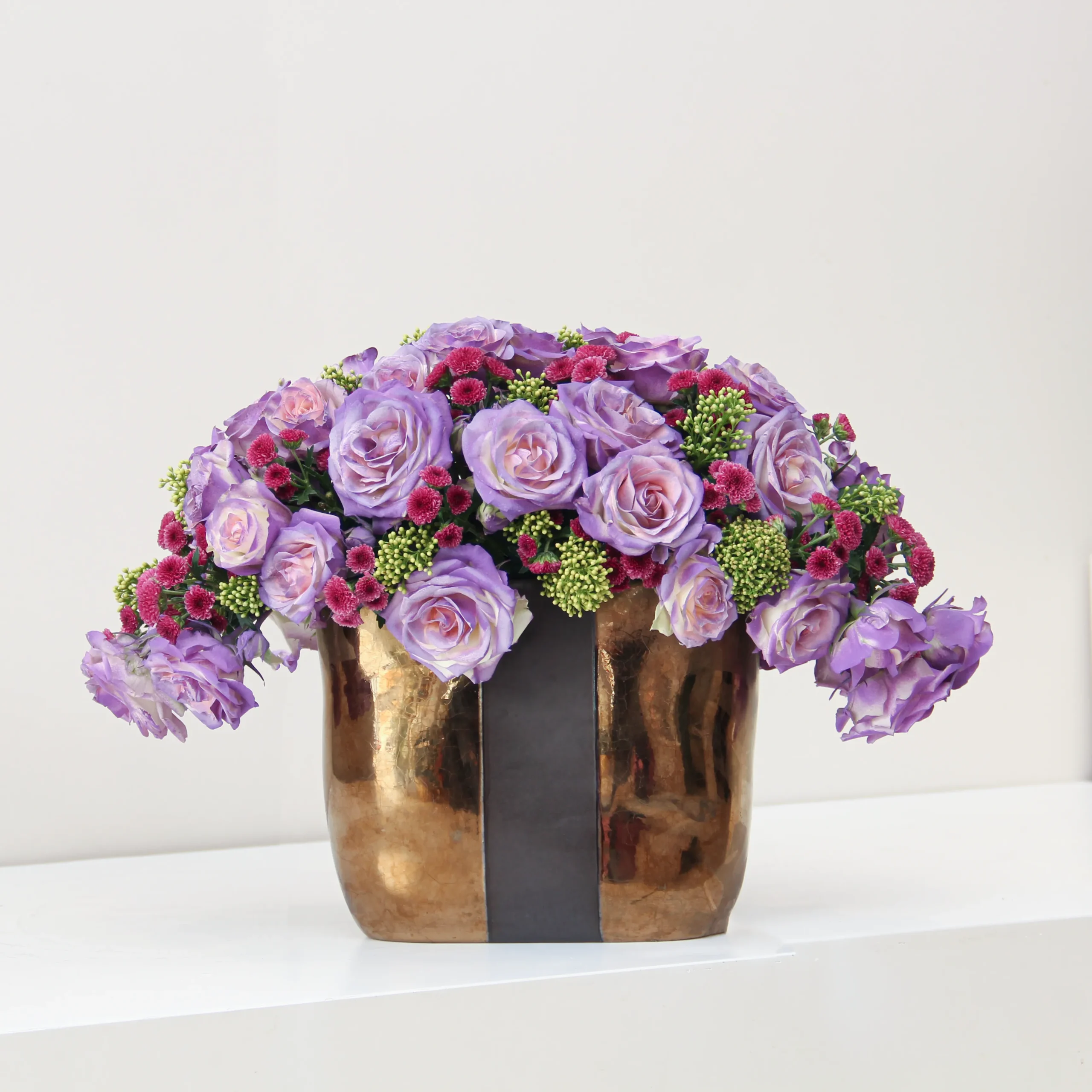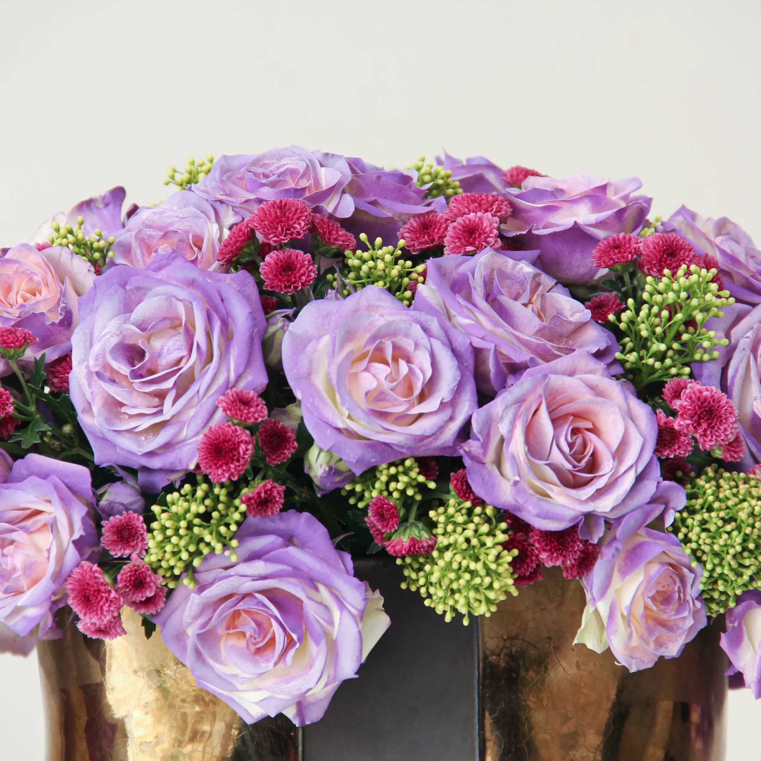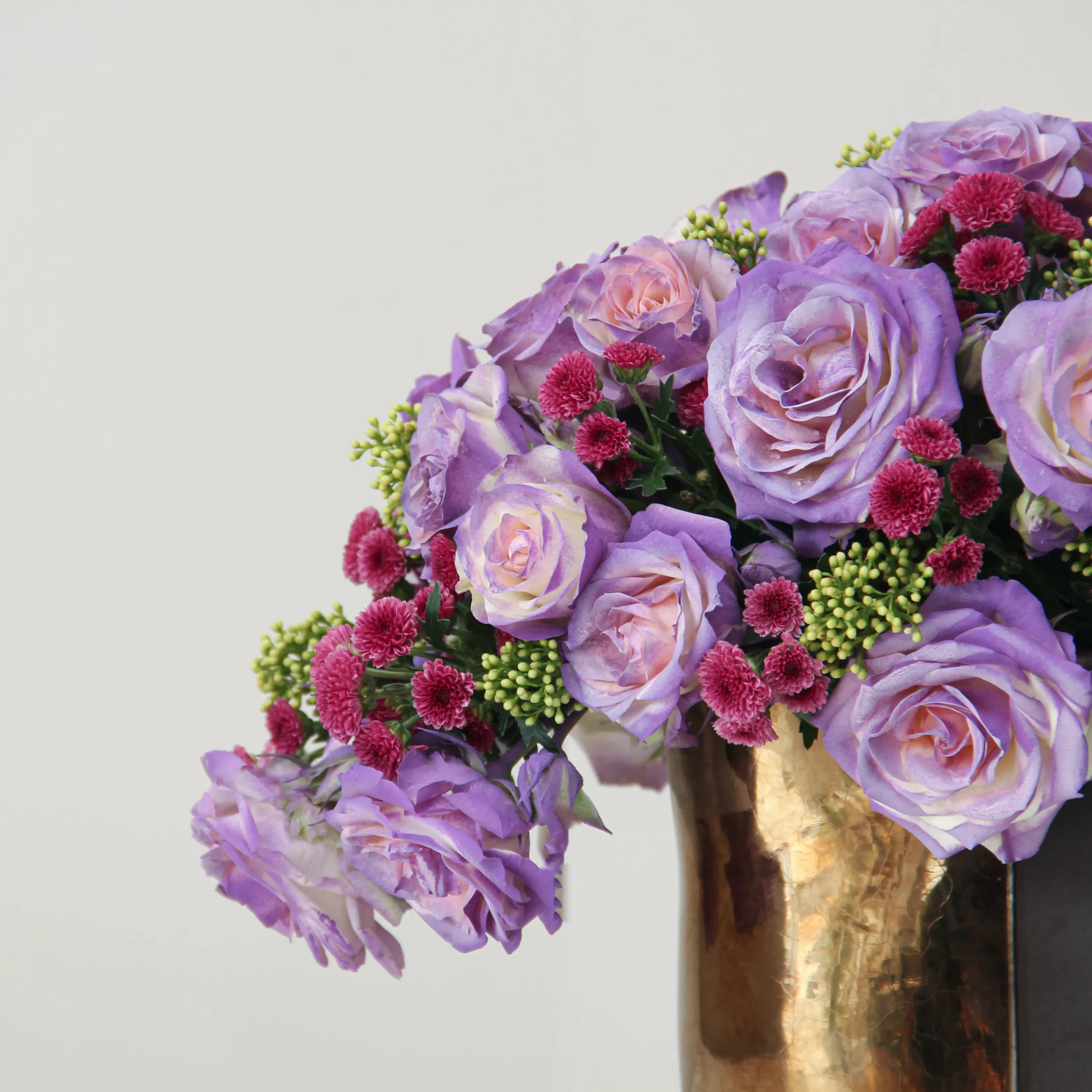 A captivating blend of purple, red, and green blooms artistically arranged in a stylish ceramic vase. adding a touch of elegance and vibrance to any room, perfect for decor or gifting.