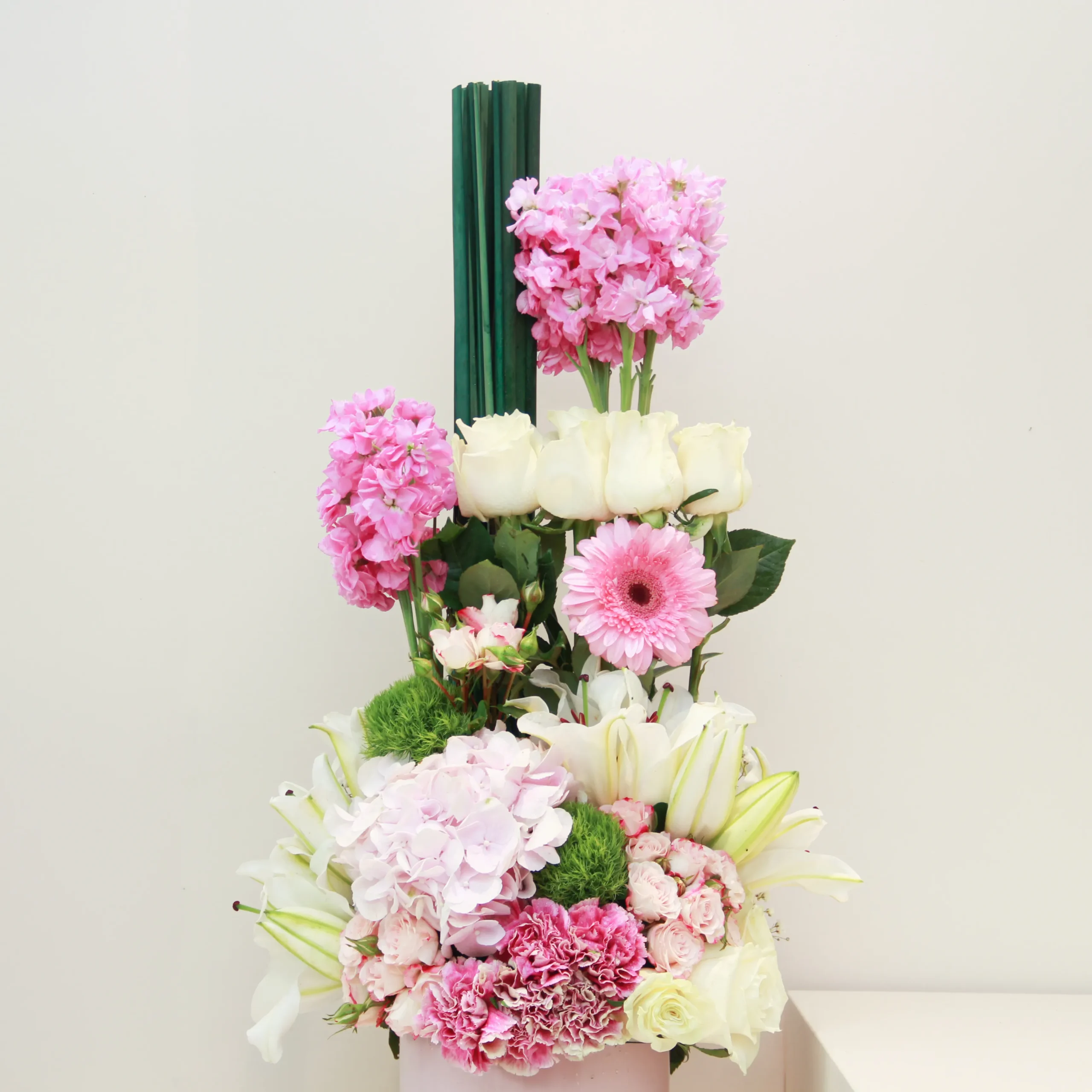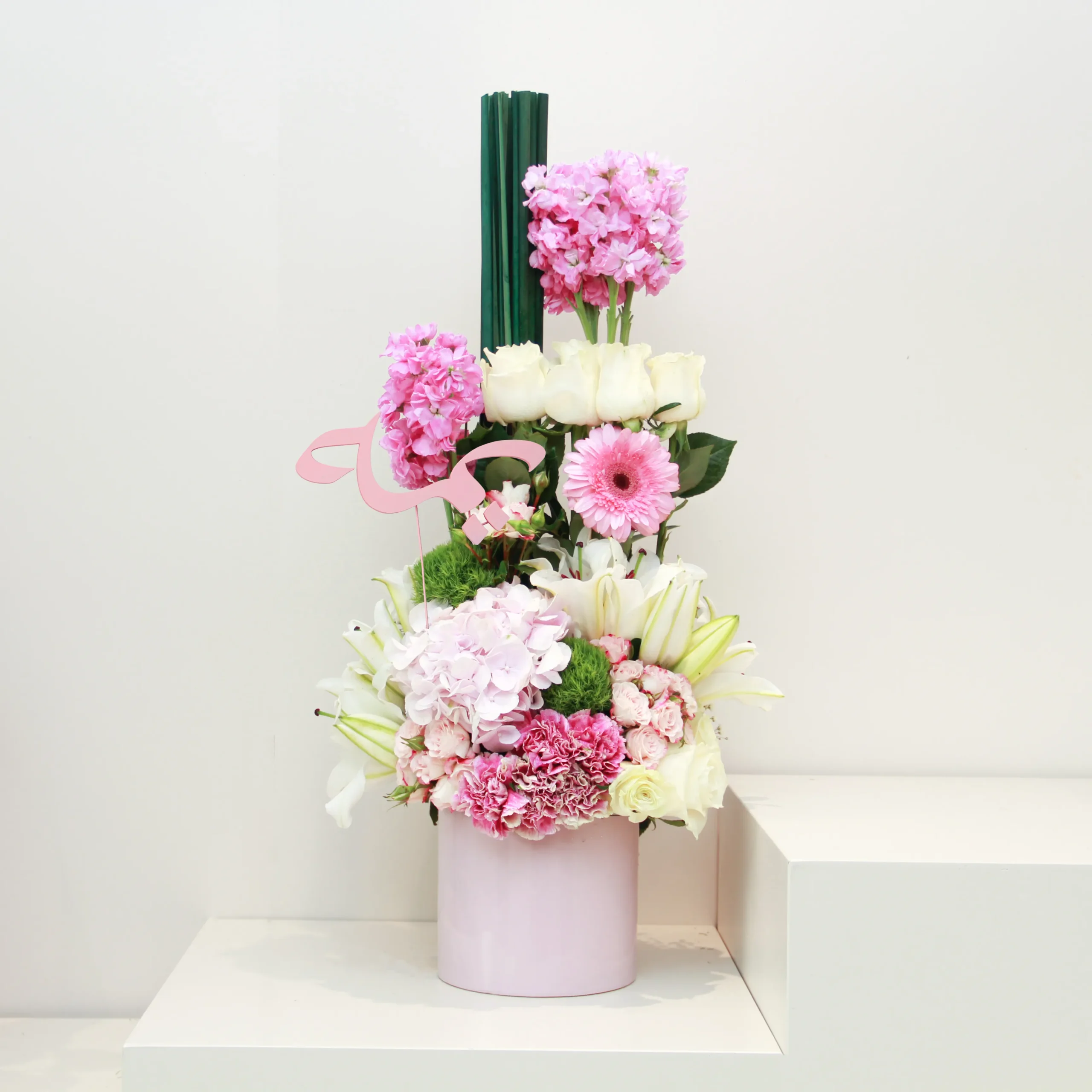 A stunning arrangement of pink, white and green flowers in a ceramic vase