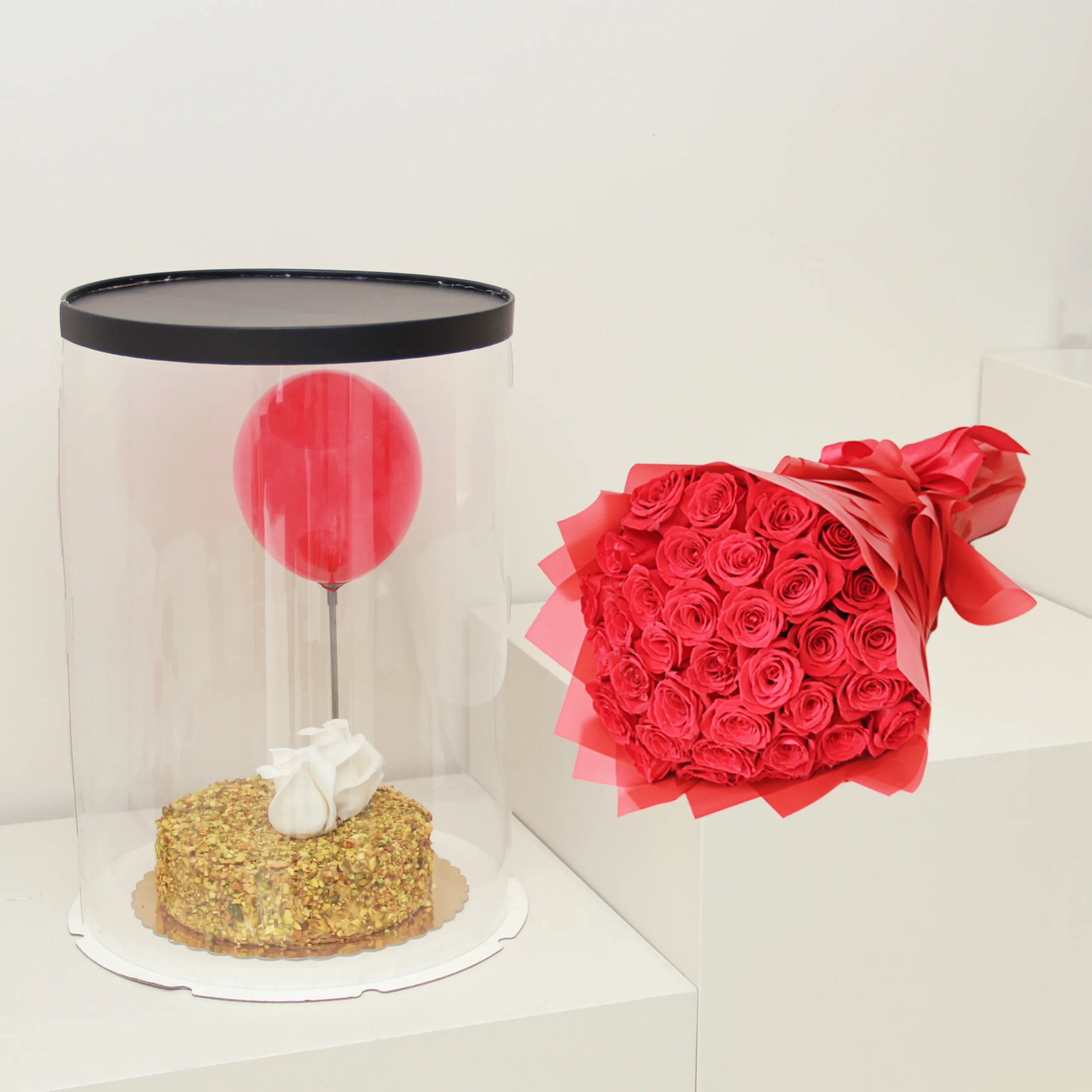 This exquisite arrangement features a harmonious blend of a big red roses bouquet, a pistachio cake, and a beautiful balloon.