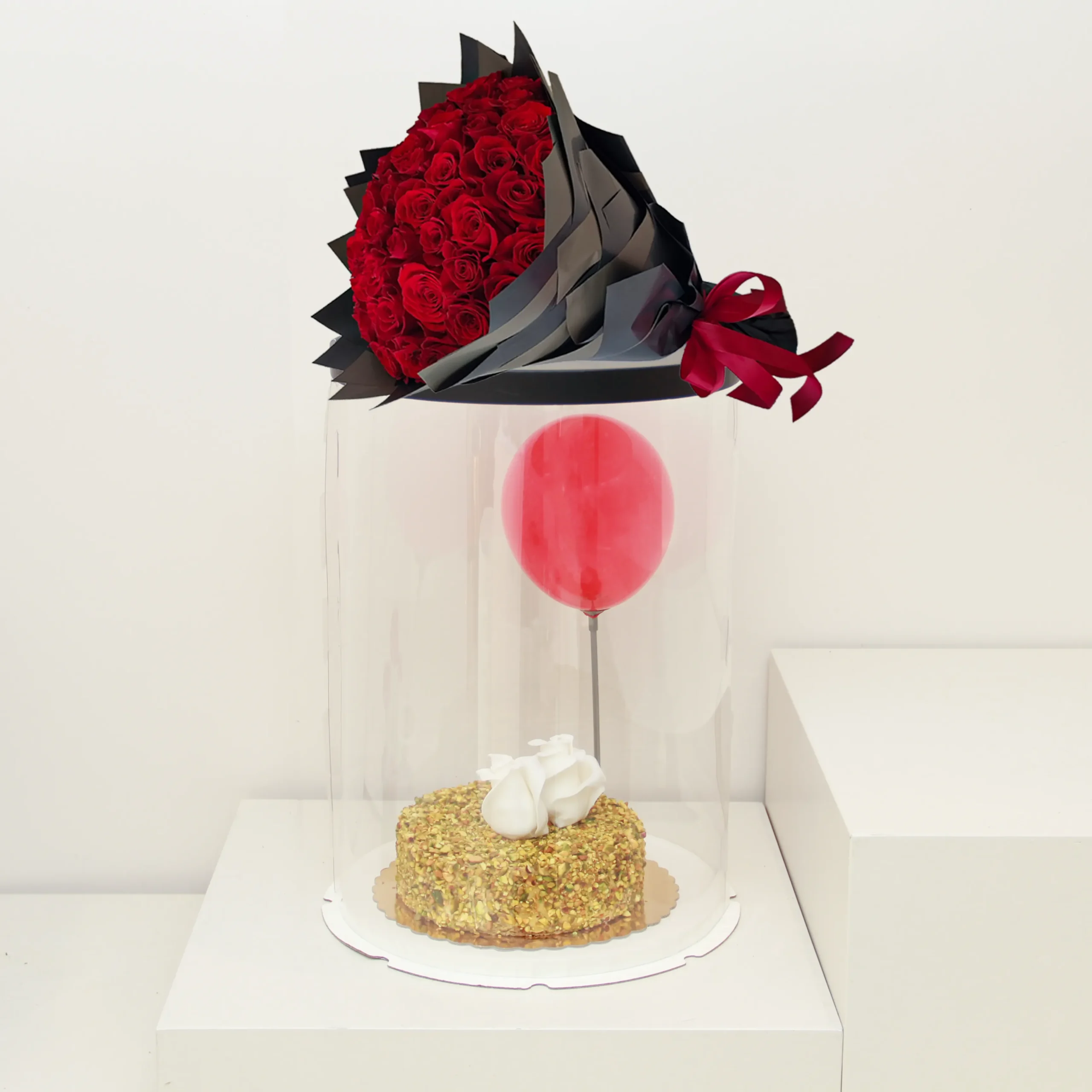 This exquisite arrangement features a harmonious blend of a big red roses bouquet, a pistachio cake, and a beautiful balloon.
