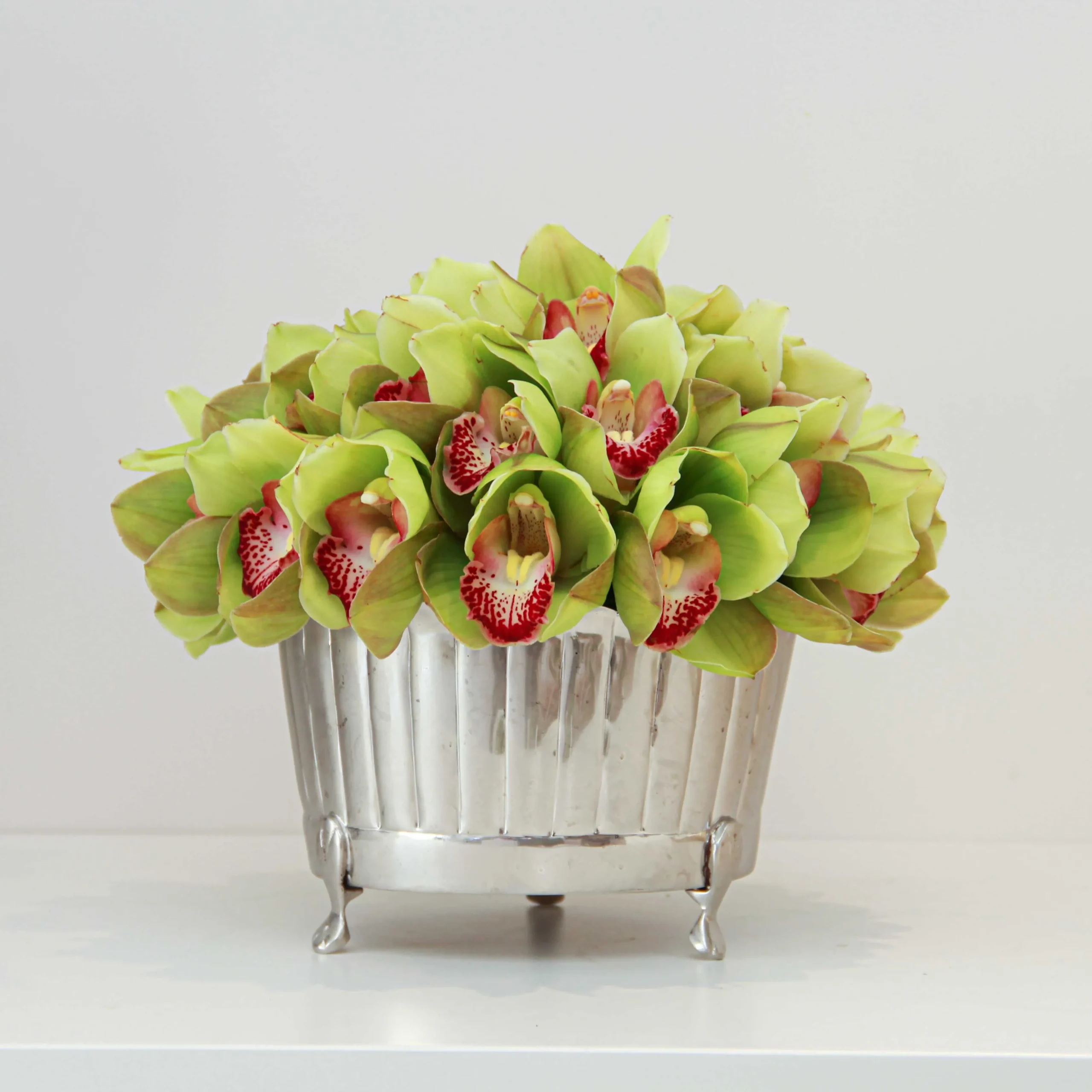 A flower arrangement designed with a Cymbidium orchid in a silver vase.
