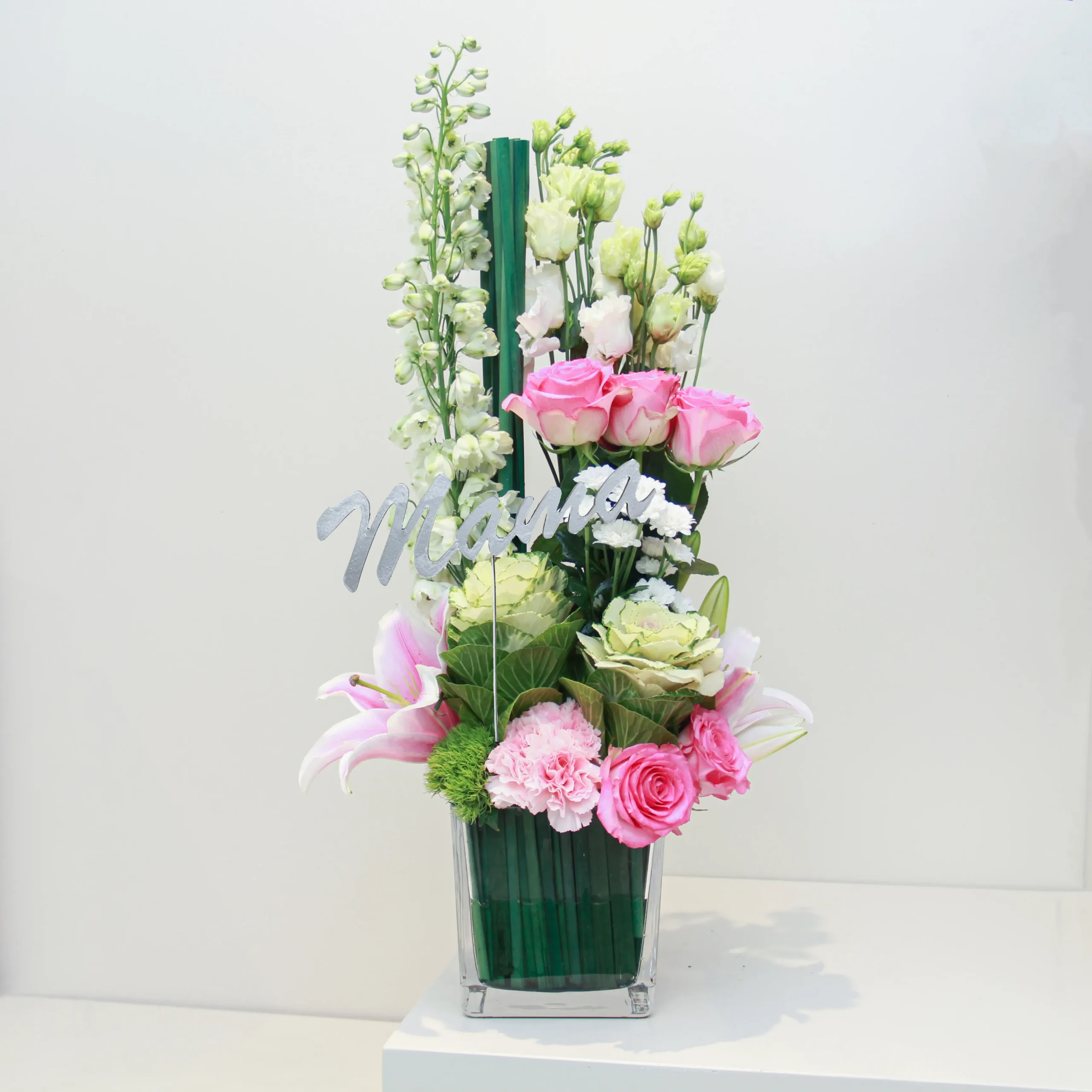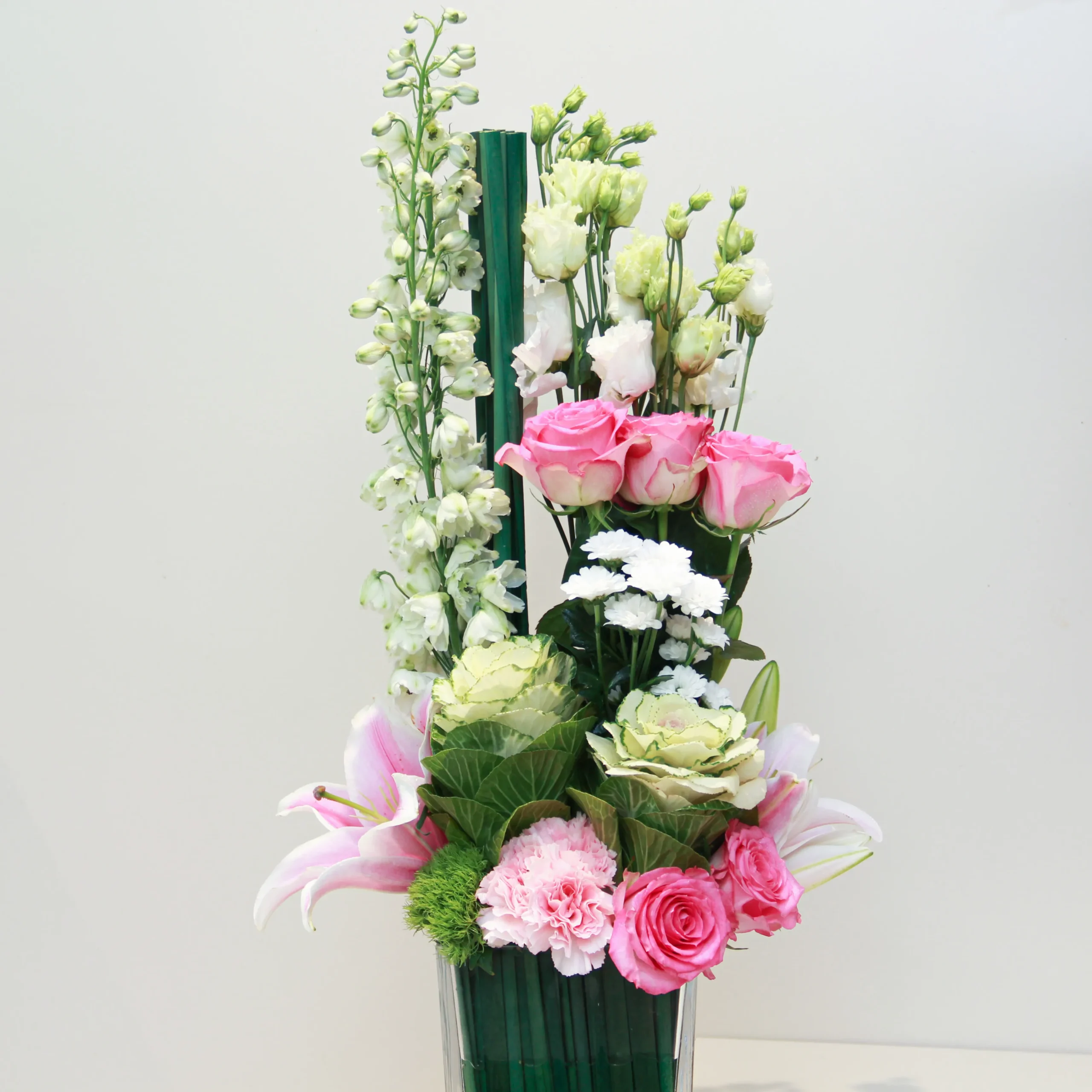 A beautiful arrangement full of mixed Pink and green flowers beautifully arranged in a glass vase.