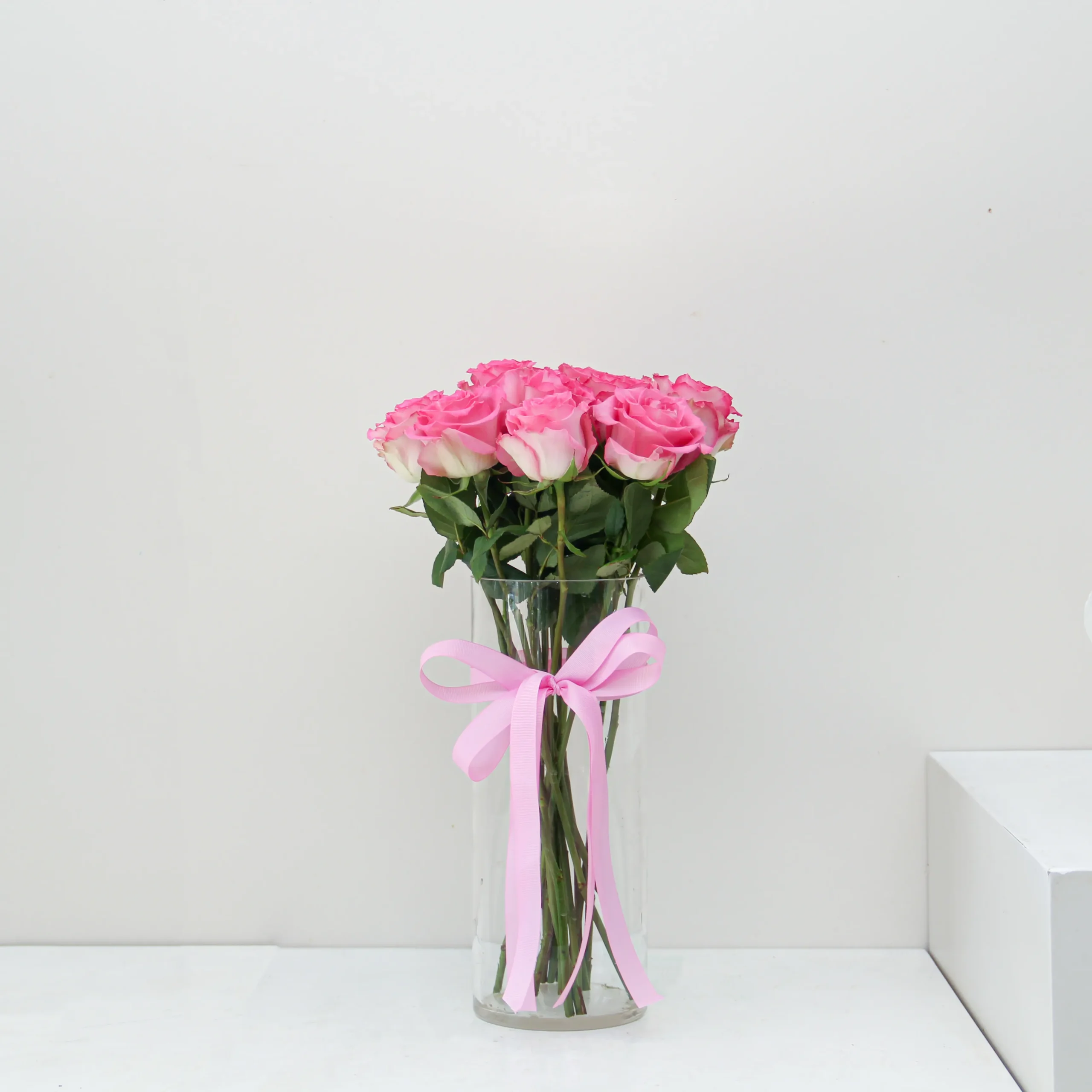 A Beautiful pink roses arranged in a glass vase.