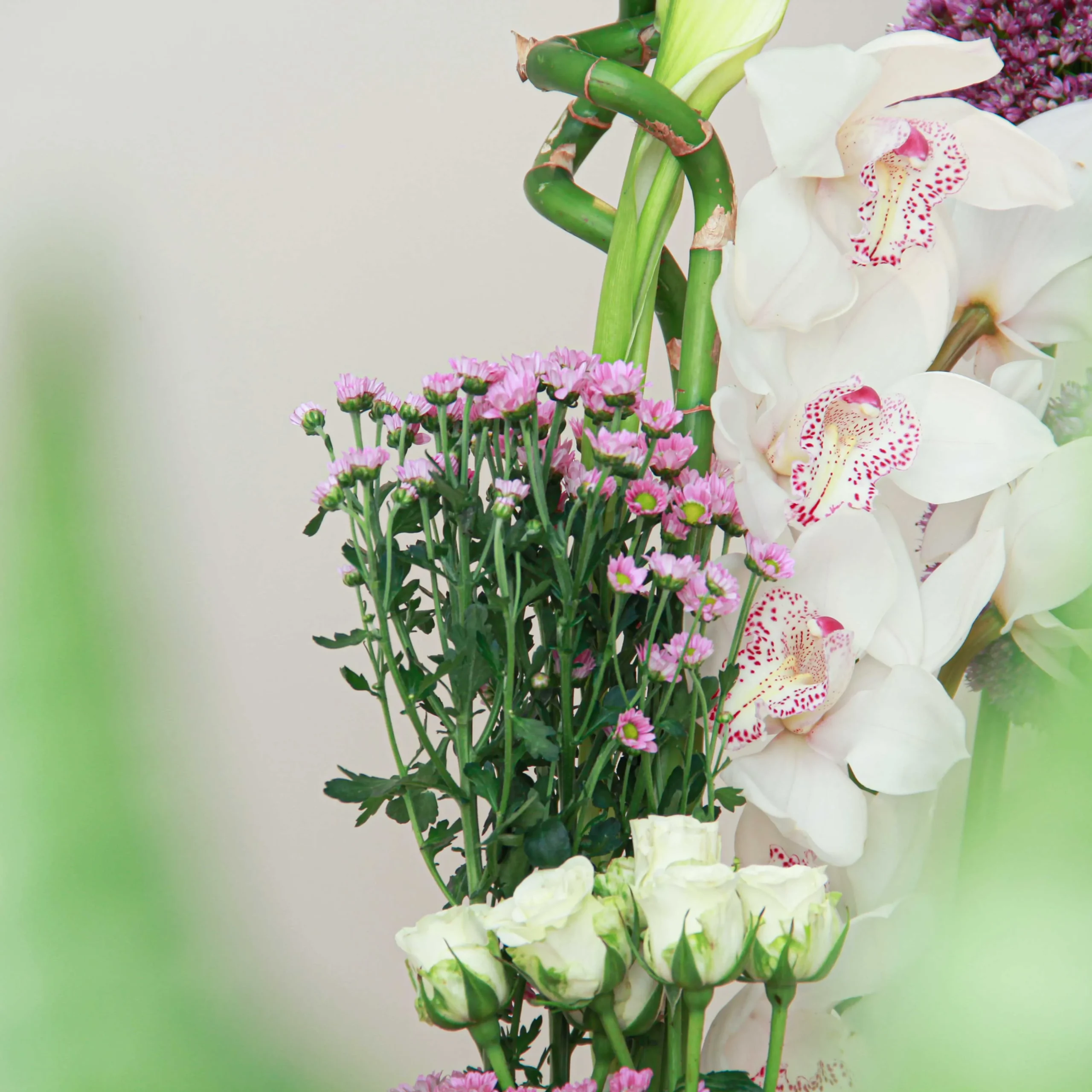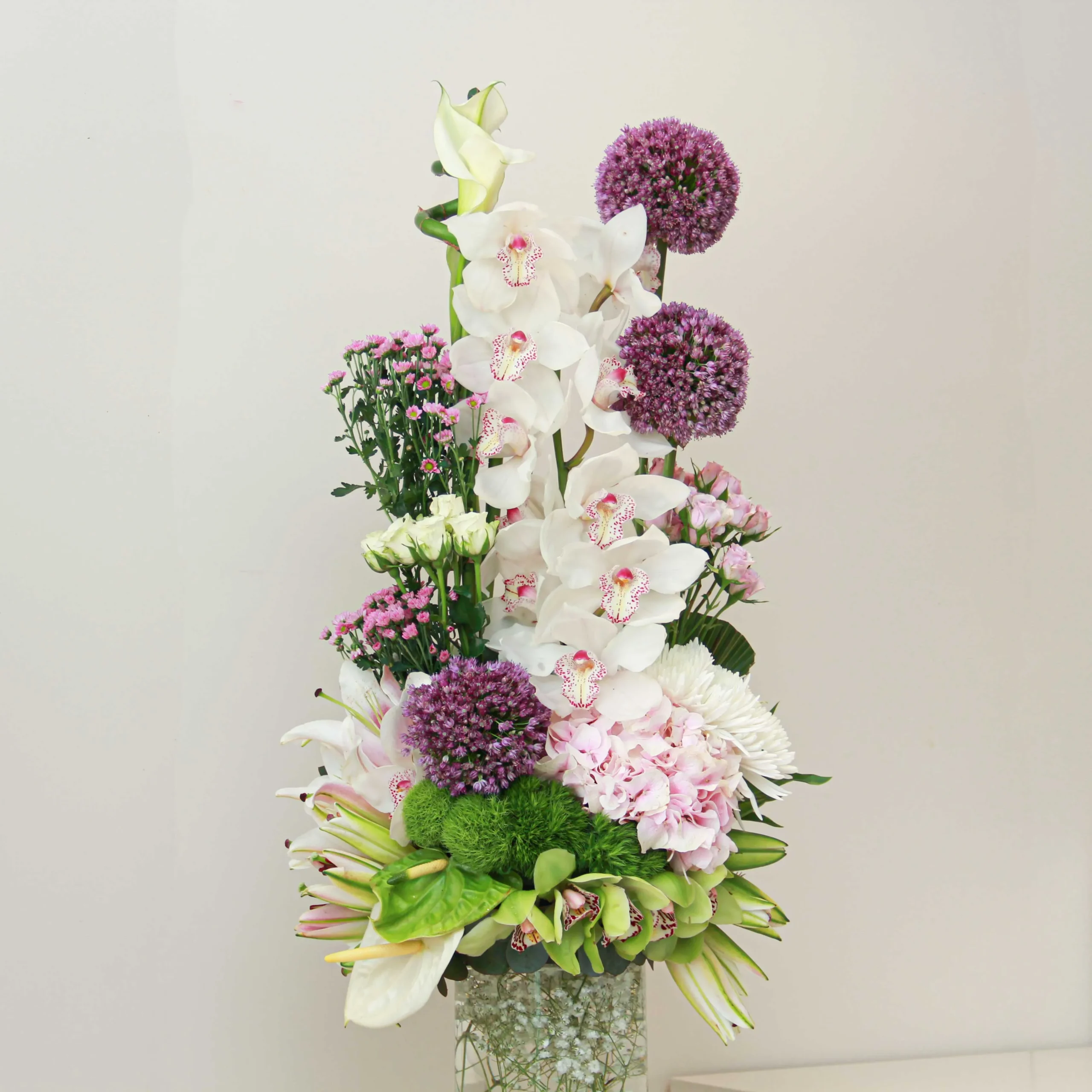 A beautiful large flower arrangement filled with pink, purple, green, and white flowers in a tall cylinder vase.