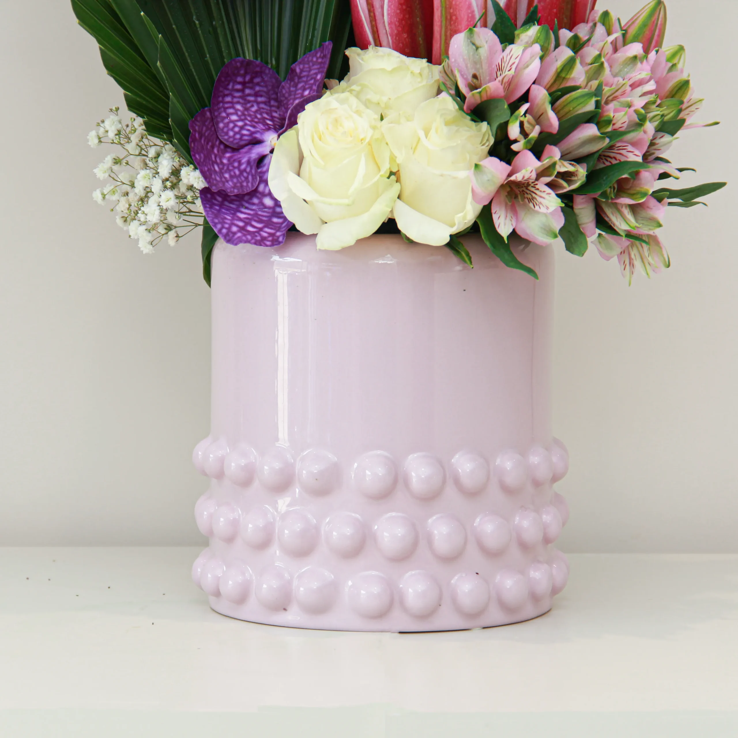 A beautiful arrangement of mixed flowers comes beautifully with a ceramic vase.