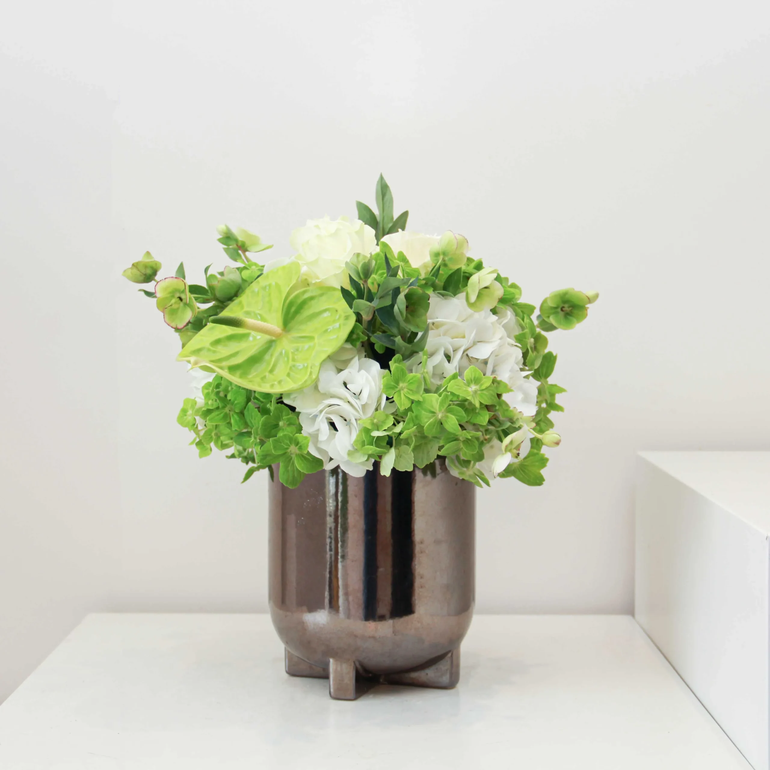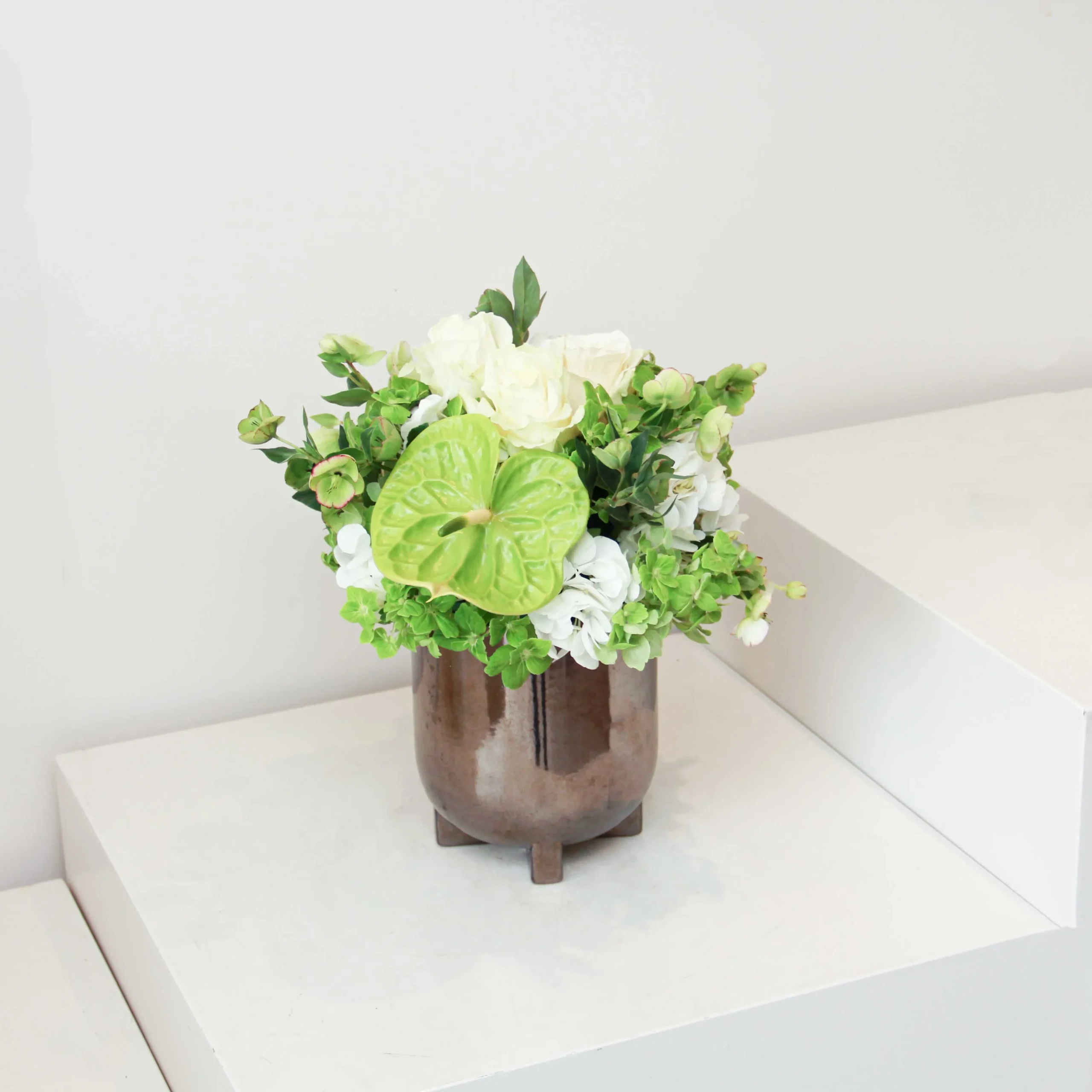A beautiful arrangement full of white roses, hydrangeas, and anthurium flowers is beautifully arranged in a ceramic vase.