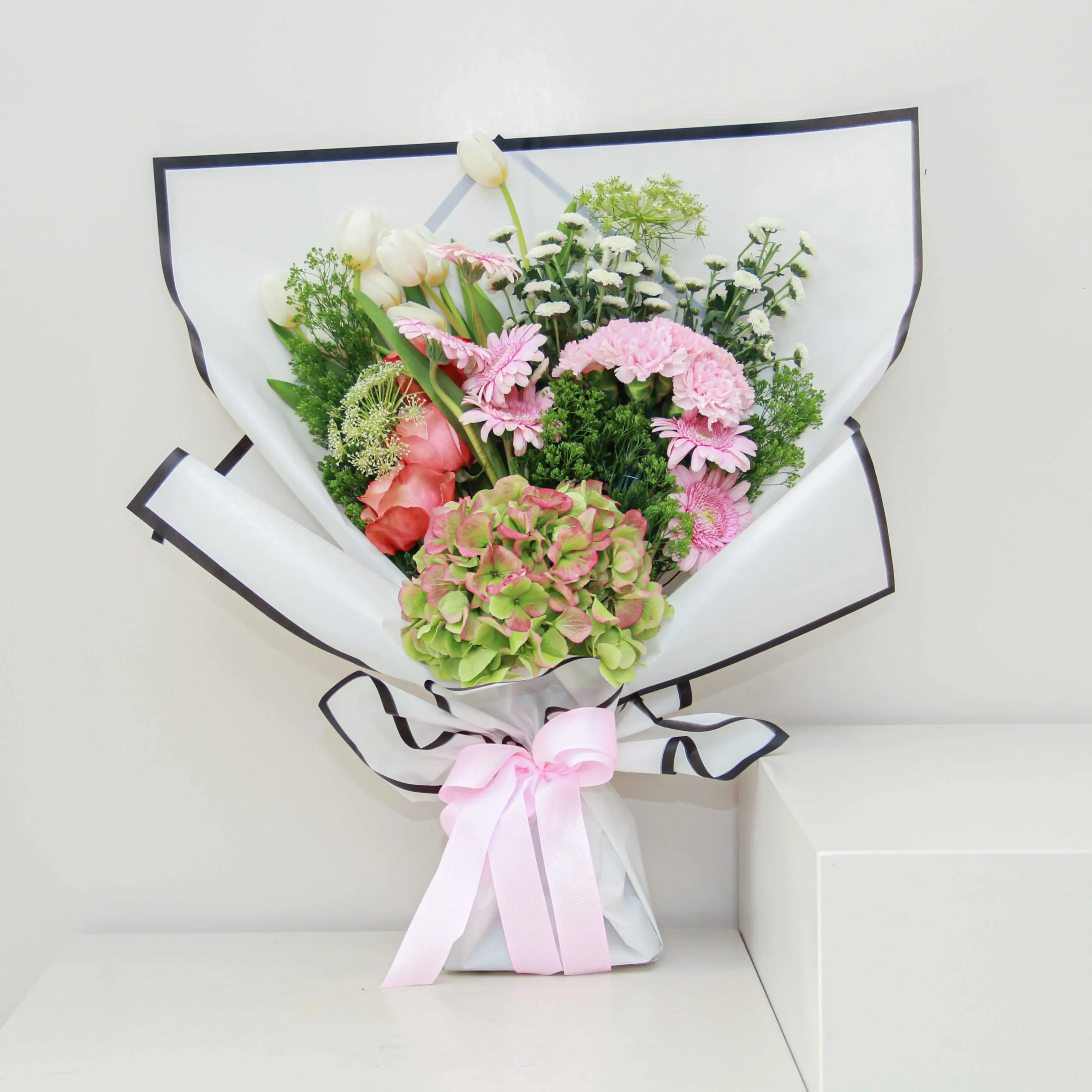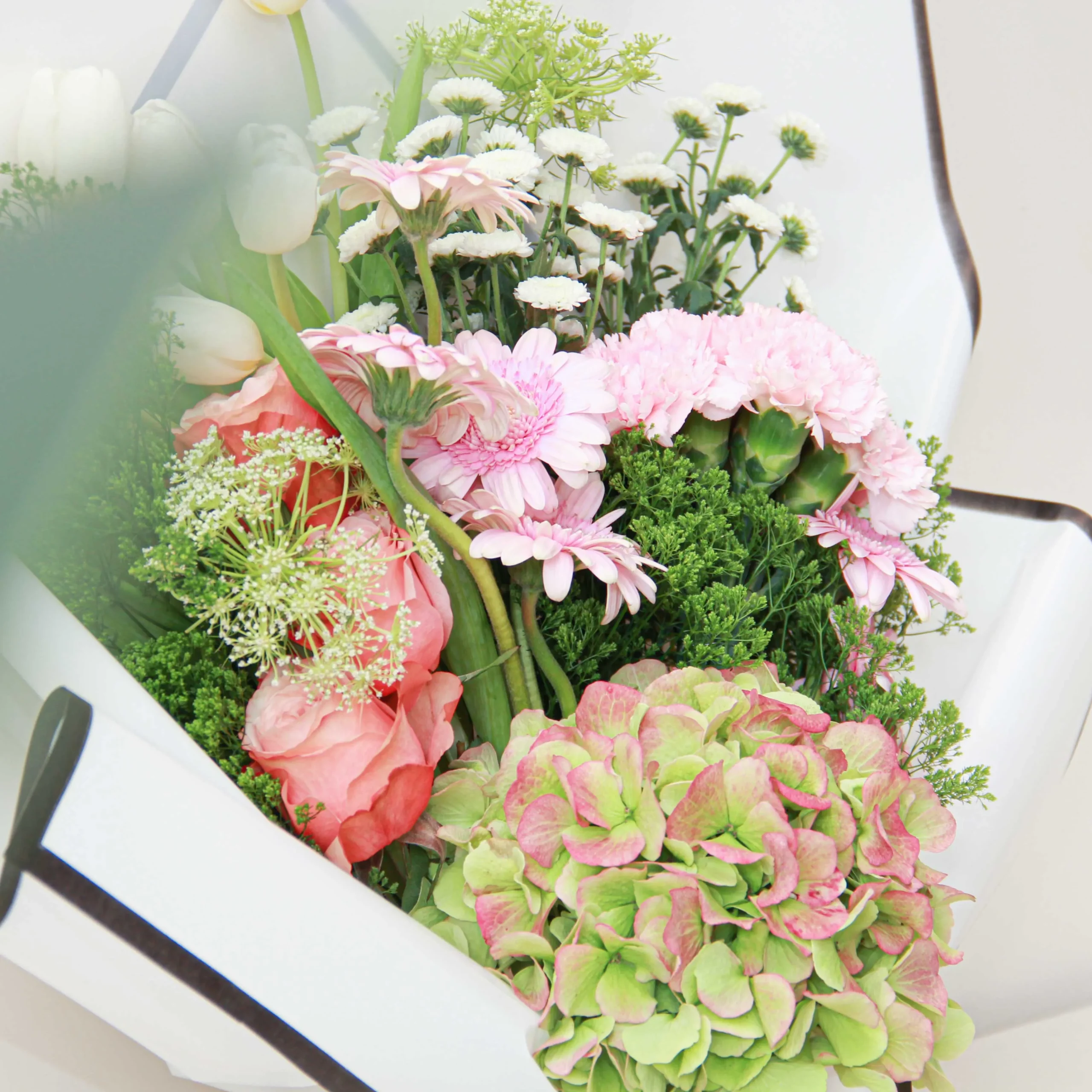 A mix of bright pink, orange, green, and white roses will send a huge smile across a loved one’s face when they receive this bouquet.