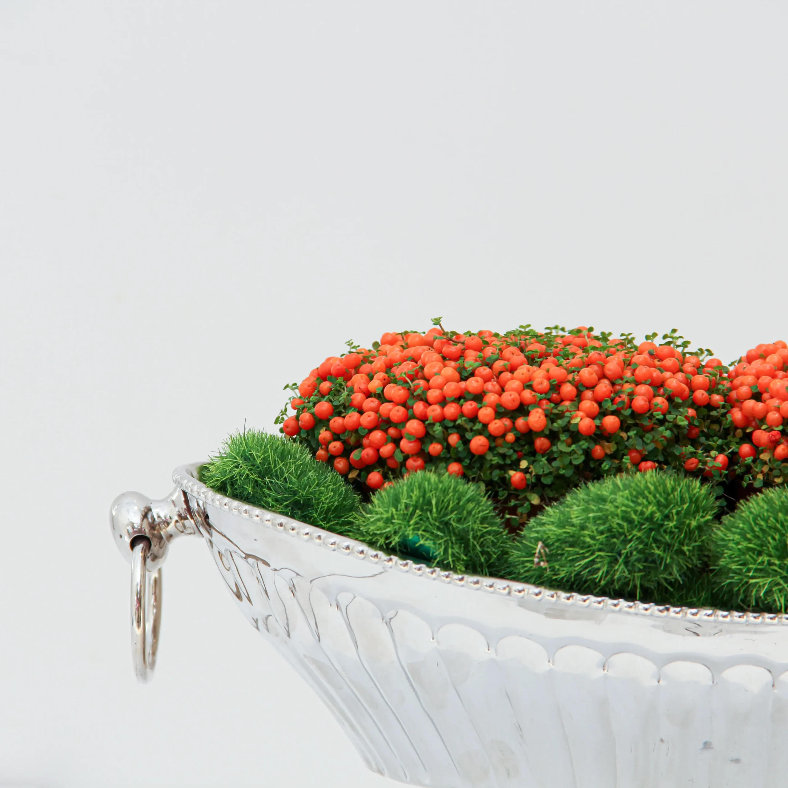The charming Nertera granadensis (Coral Bead Plant) delights with its tiny green leaves and bright orange-red berries. Perfectly planted in a sleek steel vase, it adds a modern, elegant touch to any room — ideal as a centerpiece or a thoughtful gift.