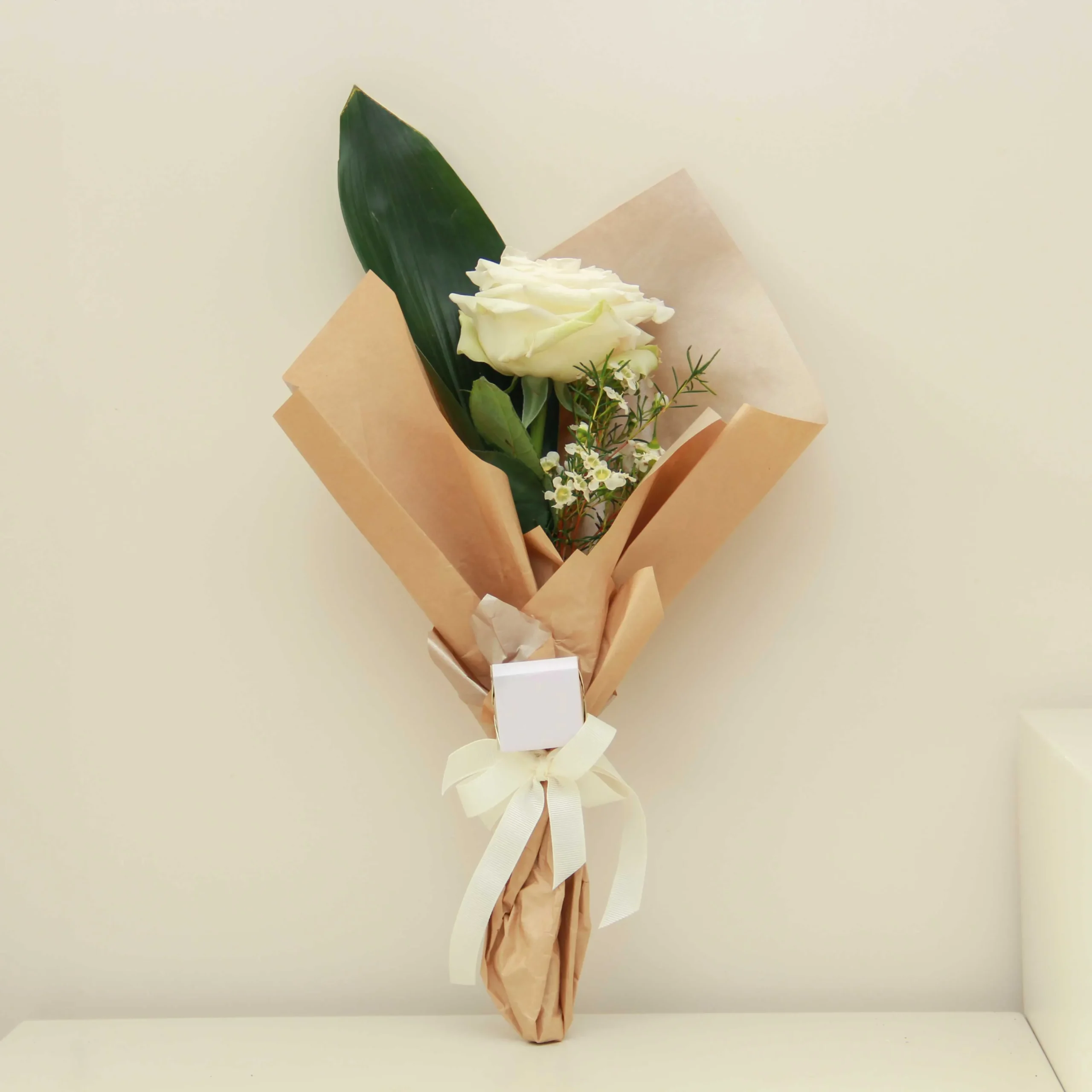 A beautiful bouquet of white roses and chocolate neatly wrapped in paper.
