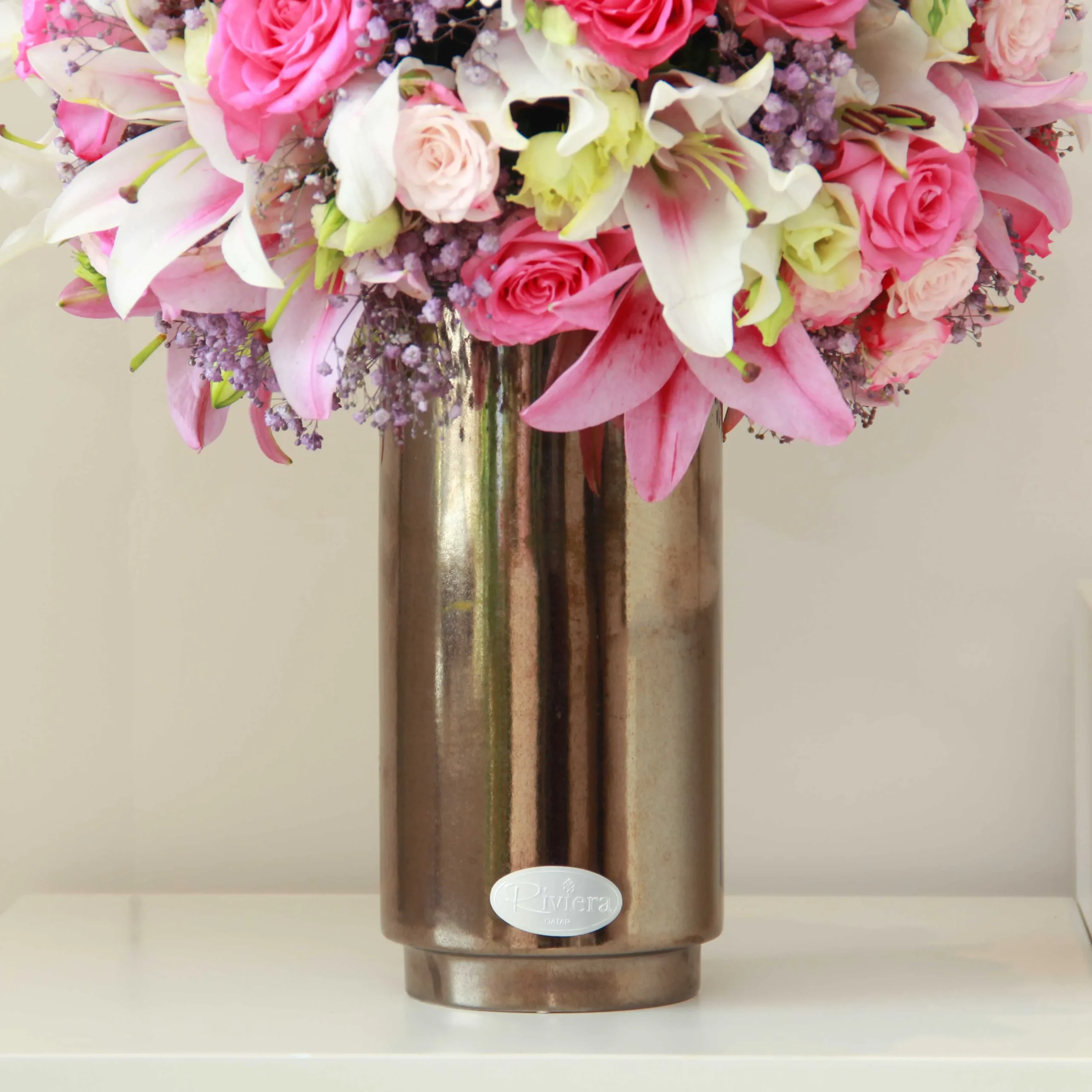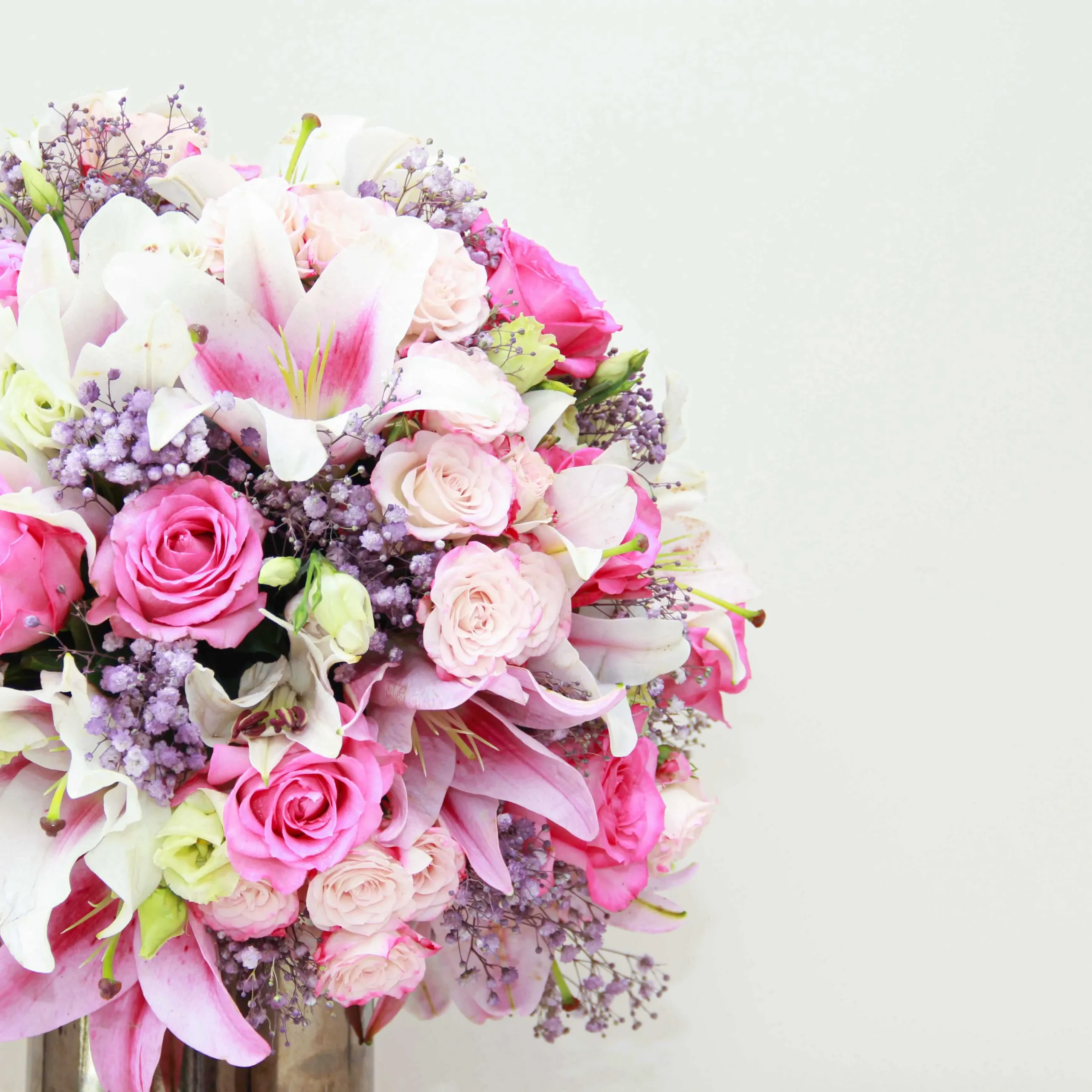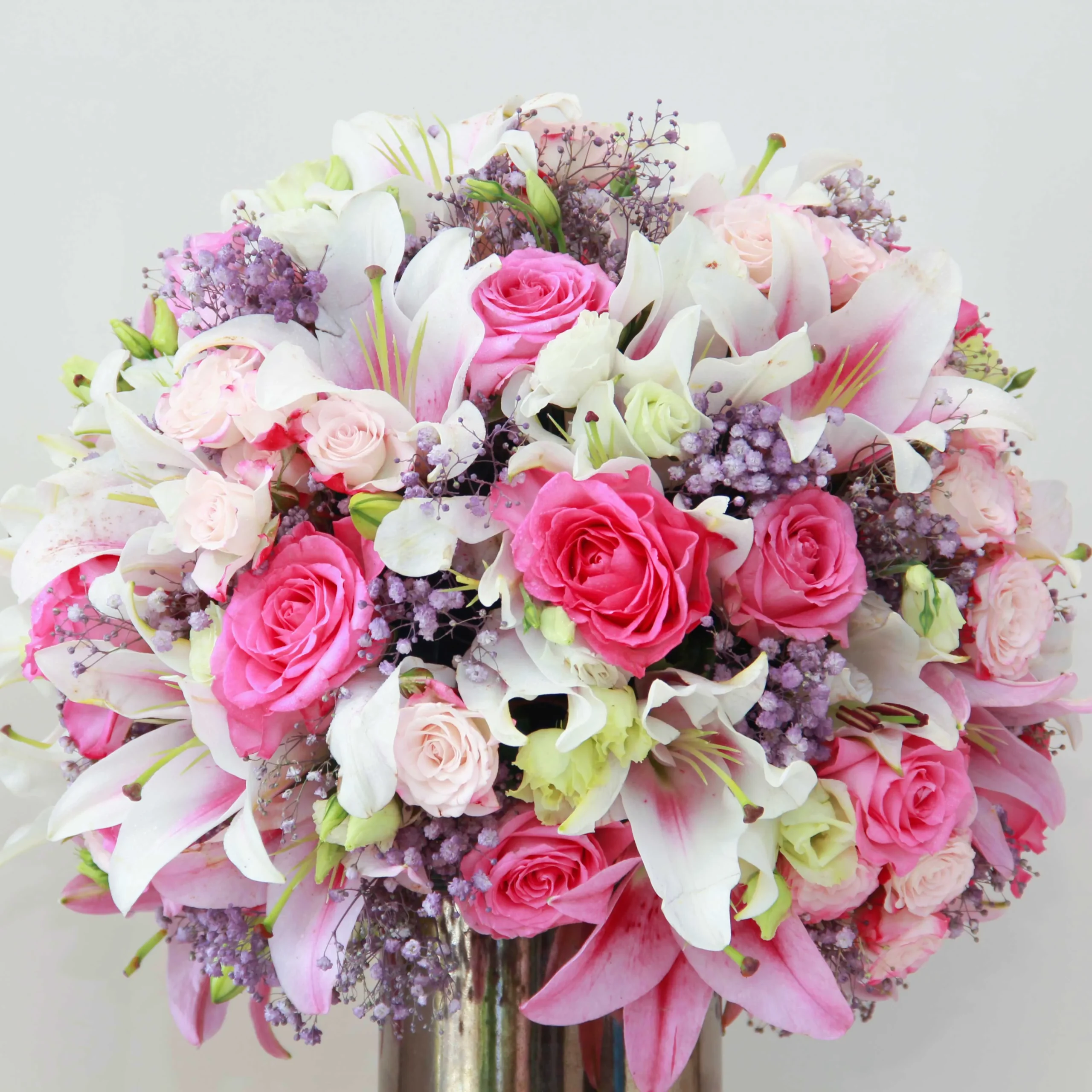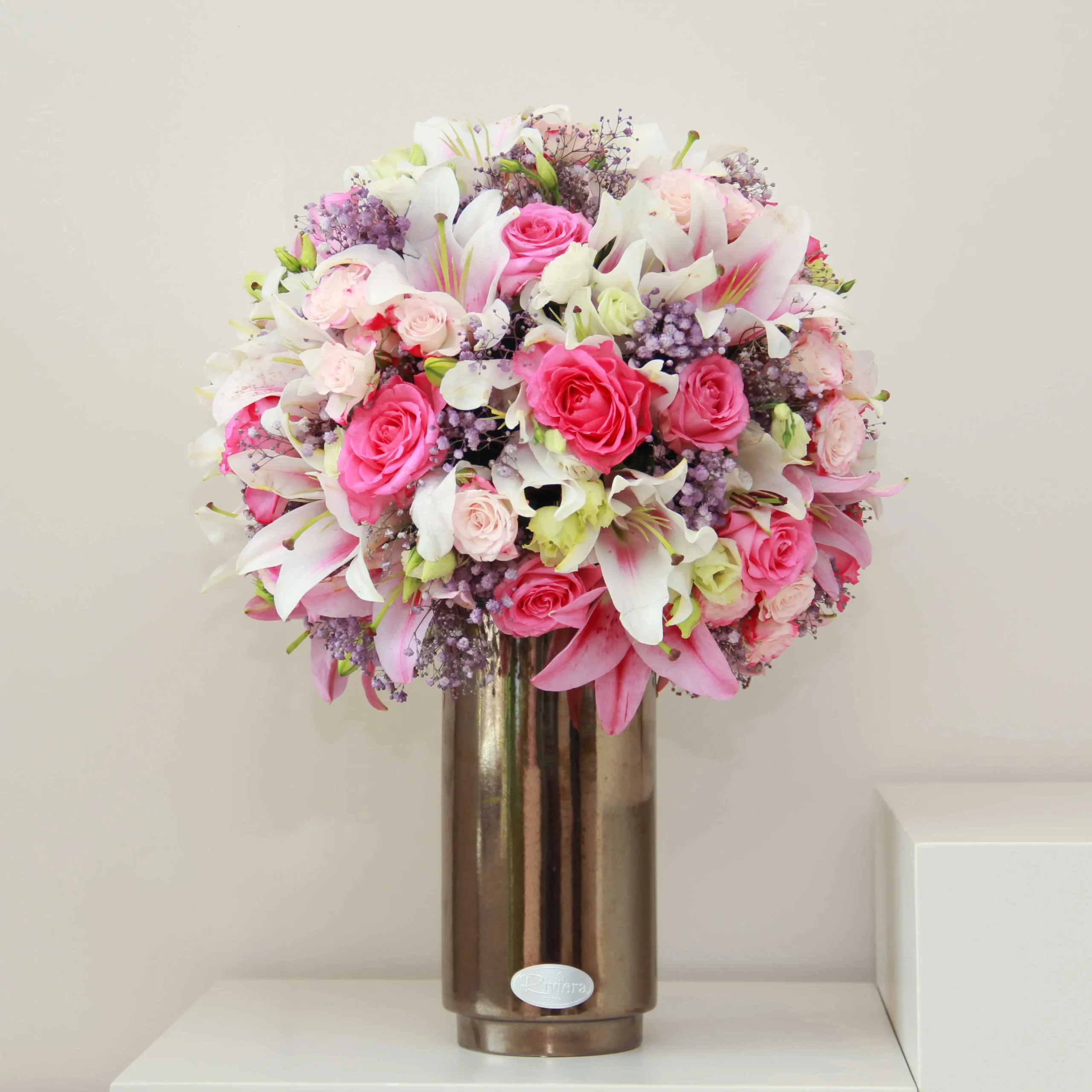 Perfectly blossoming, this stunning floral arrangement features pink roses, pink lilies, pink baby roses, and white spray roses, creating a setting with color and style.