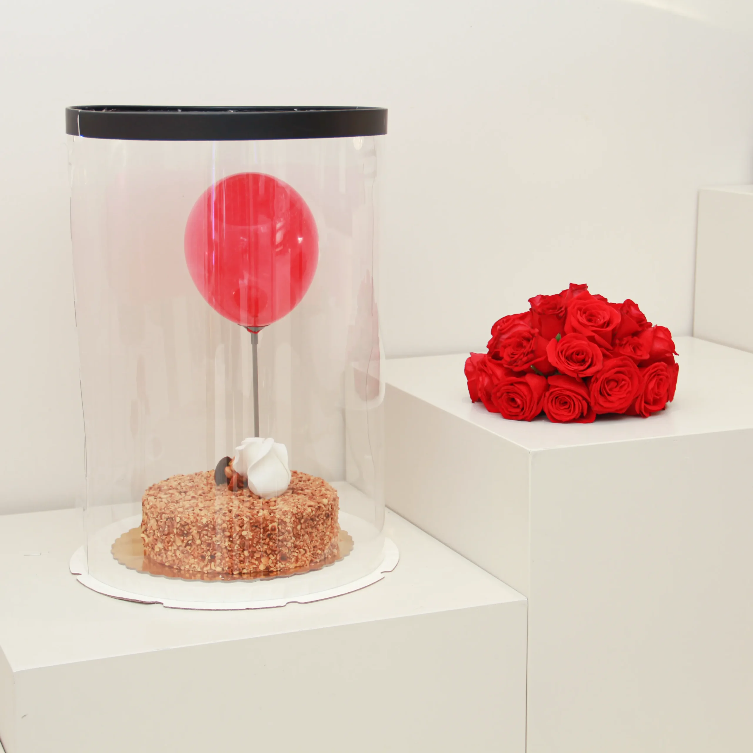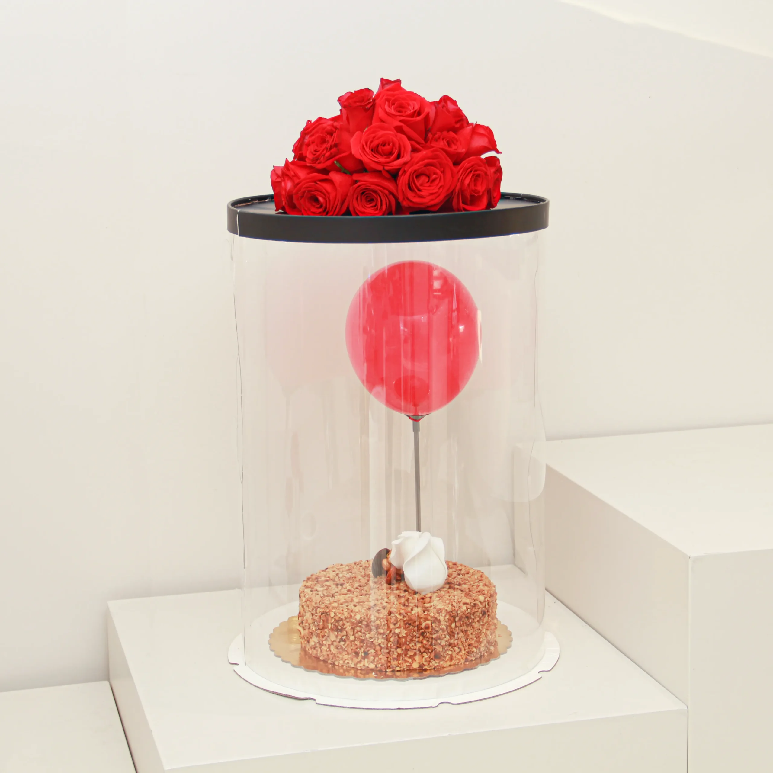 This exquisite arrangement features a harmonious blend of a roses flower arrangement, a hazelnut cake, and a beautiful balloon.