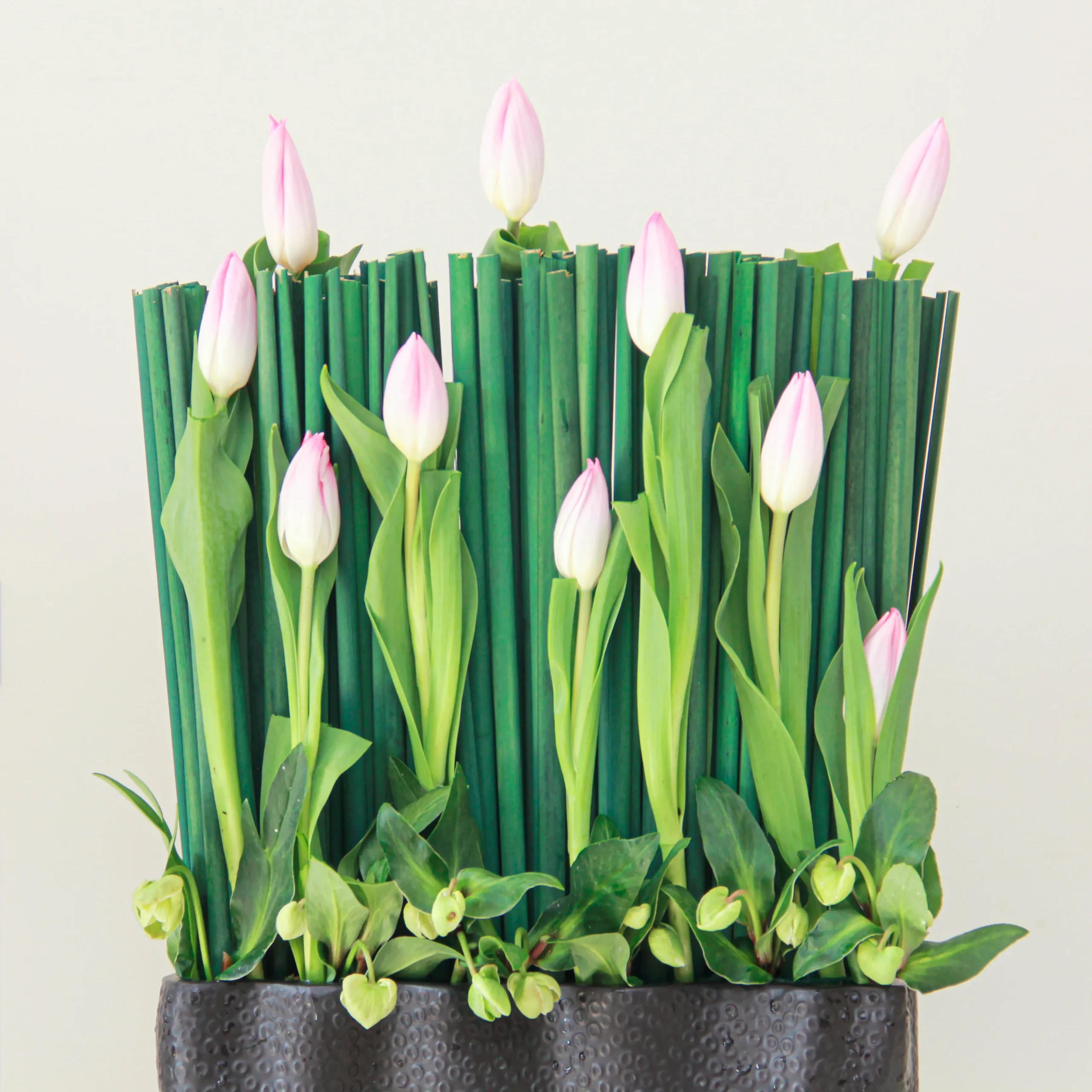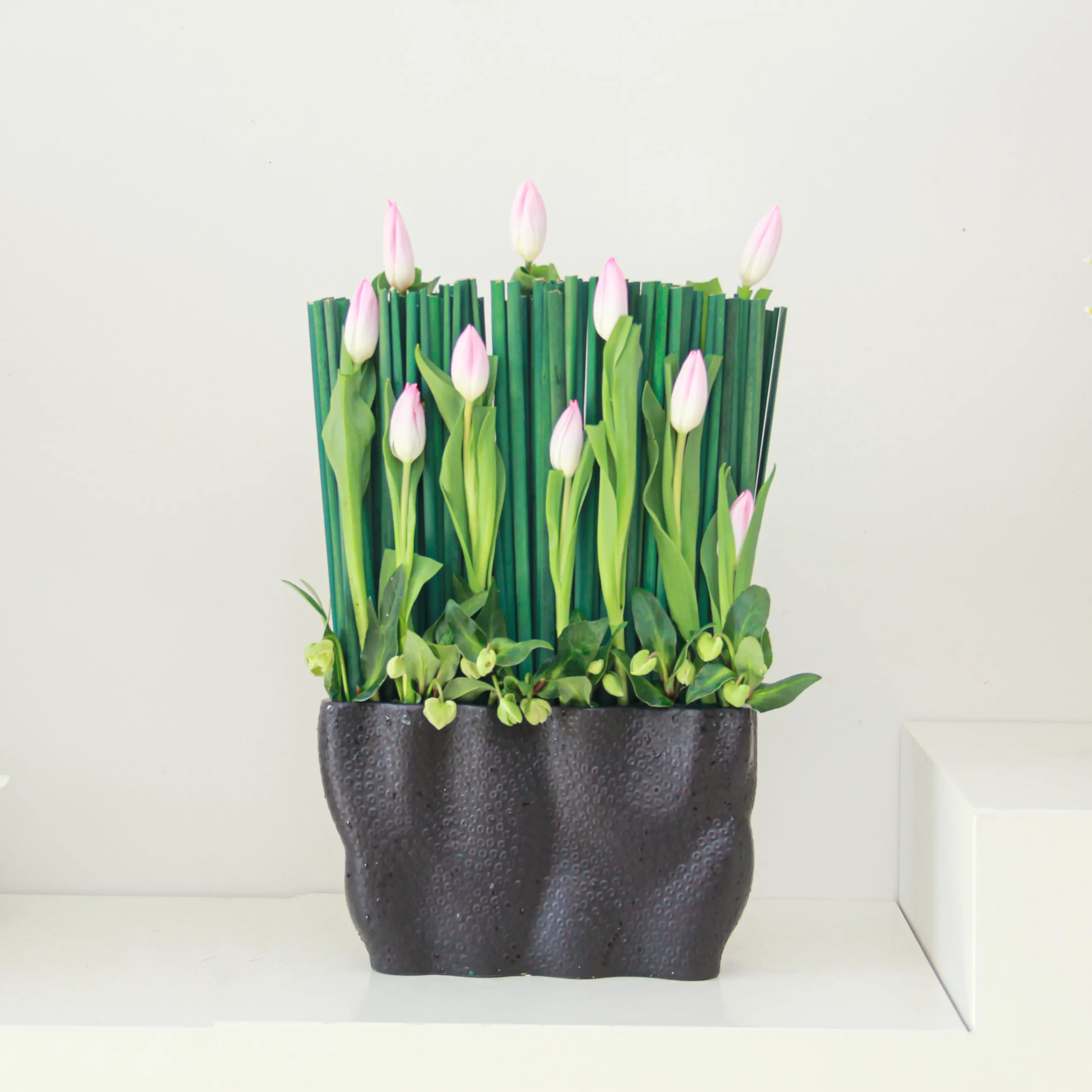 A beautiful arrangement of pink tulips comes beautifully with the ceramic vase.