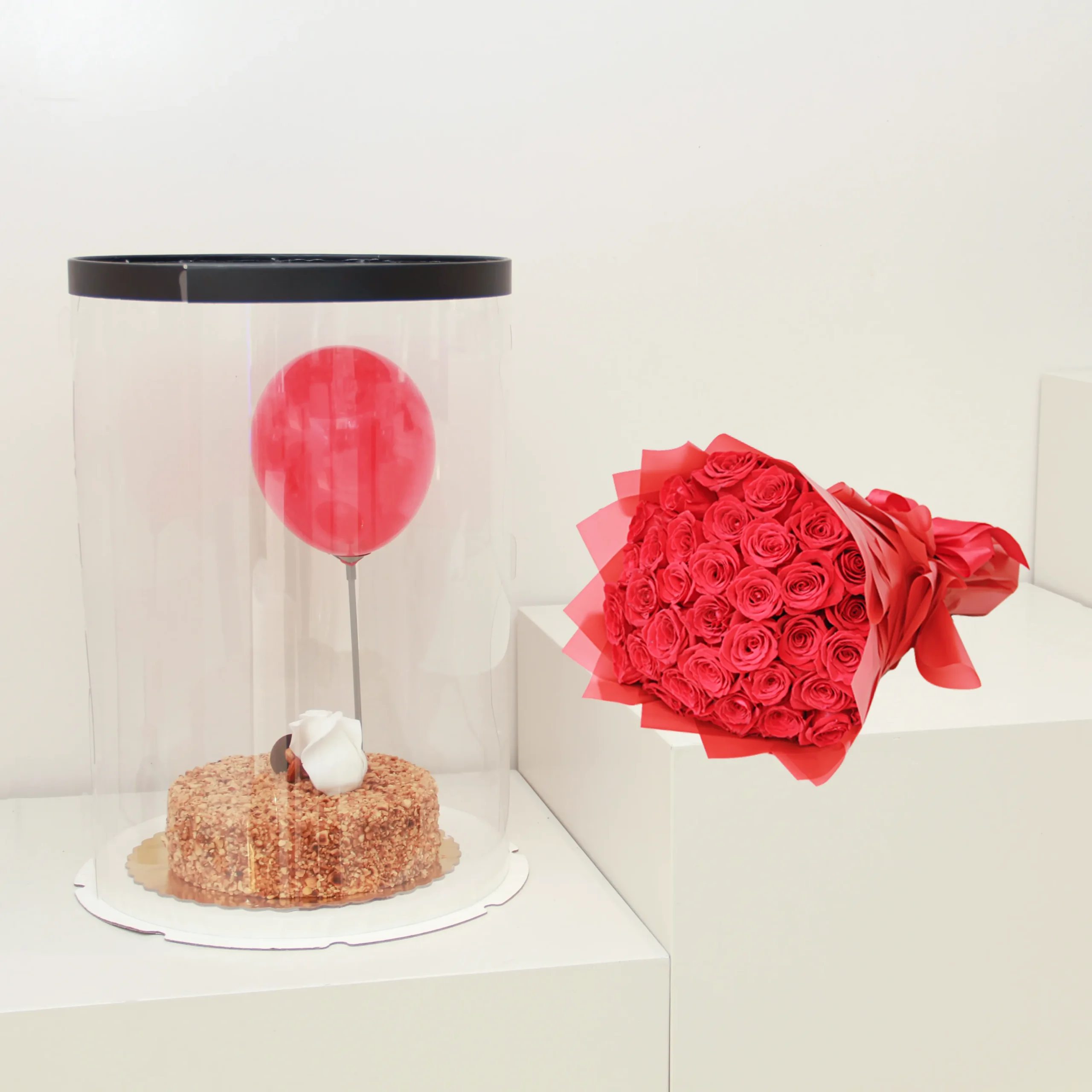 This exquisite arrangement features a harmonious blend of a big red roses bouquet, a Hazelnut Cake, and a beautiful balloon.