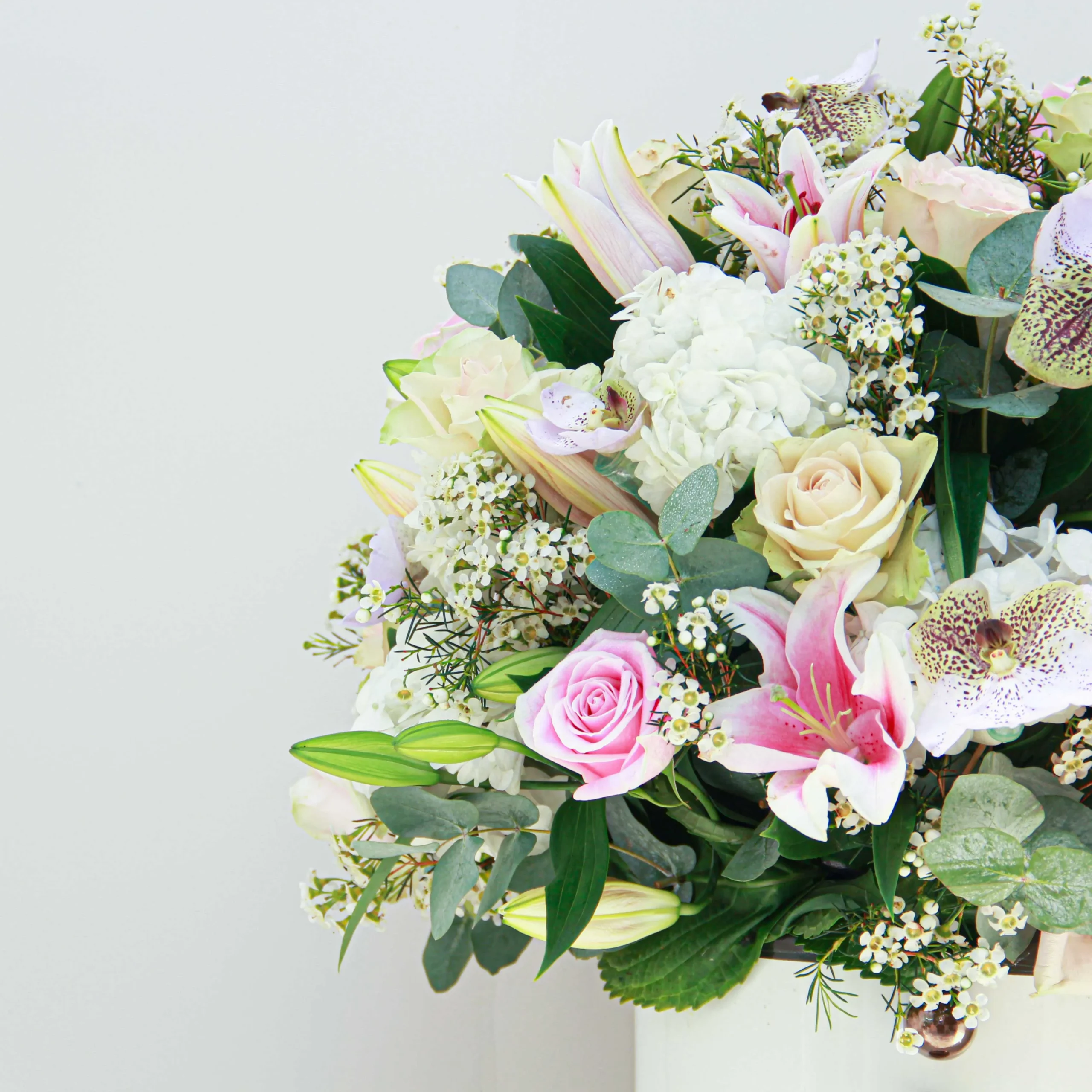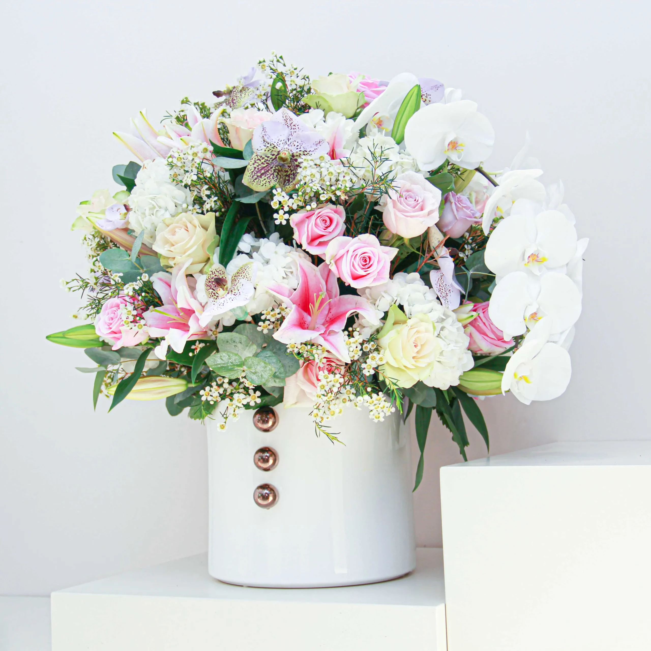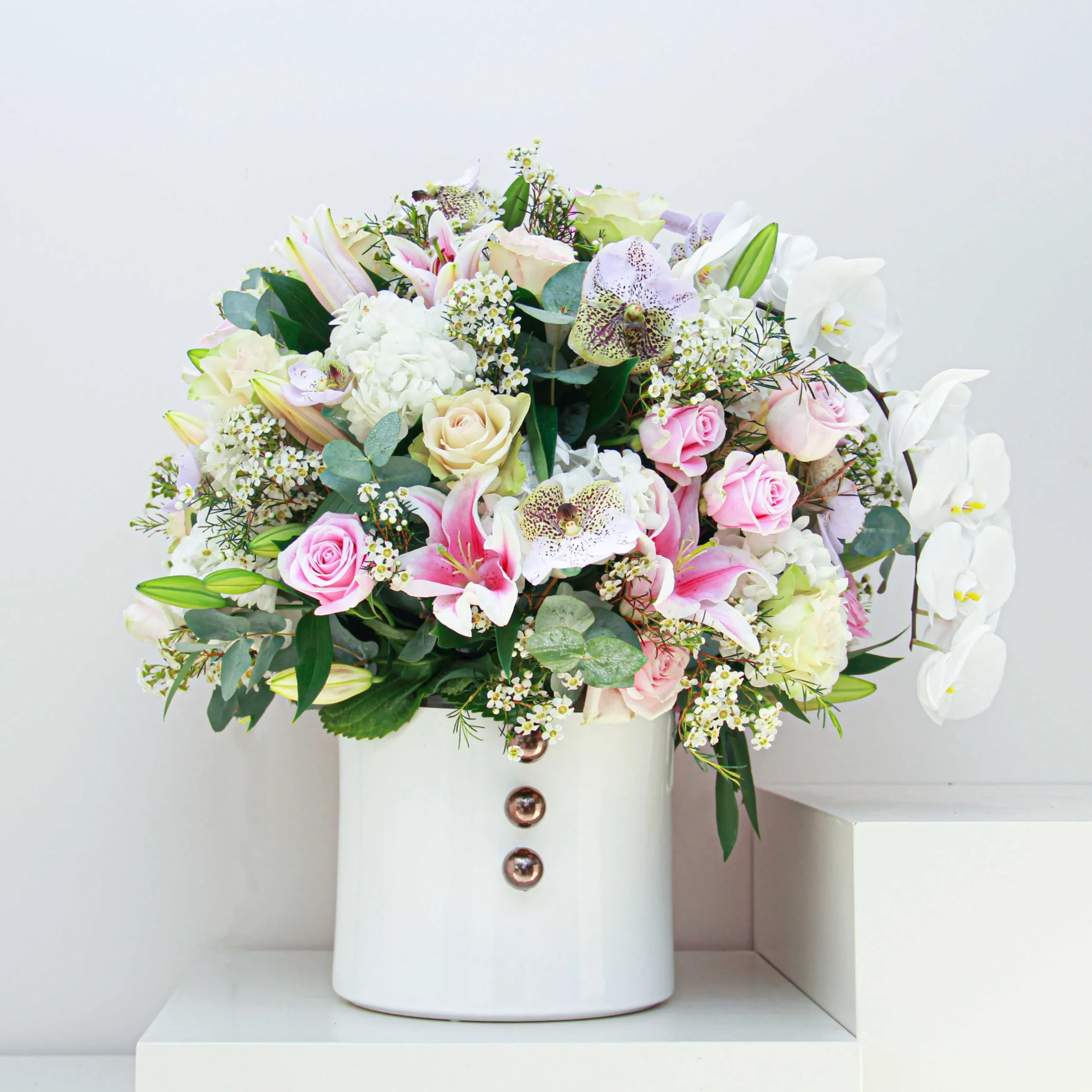 A beautiful mixed-flower arrangement in a ceramic vase. Whether you’re looking to express your love, extend congratulations, or show appreciation, this arrangement will always be a first choice for any occasion.