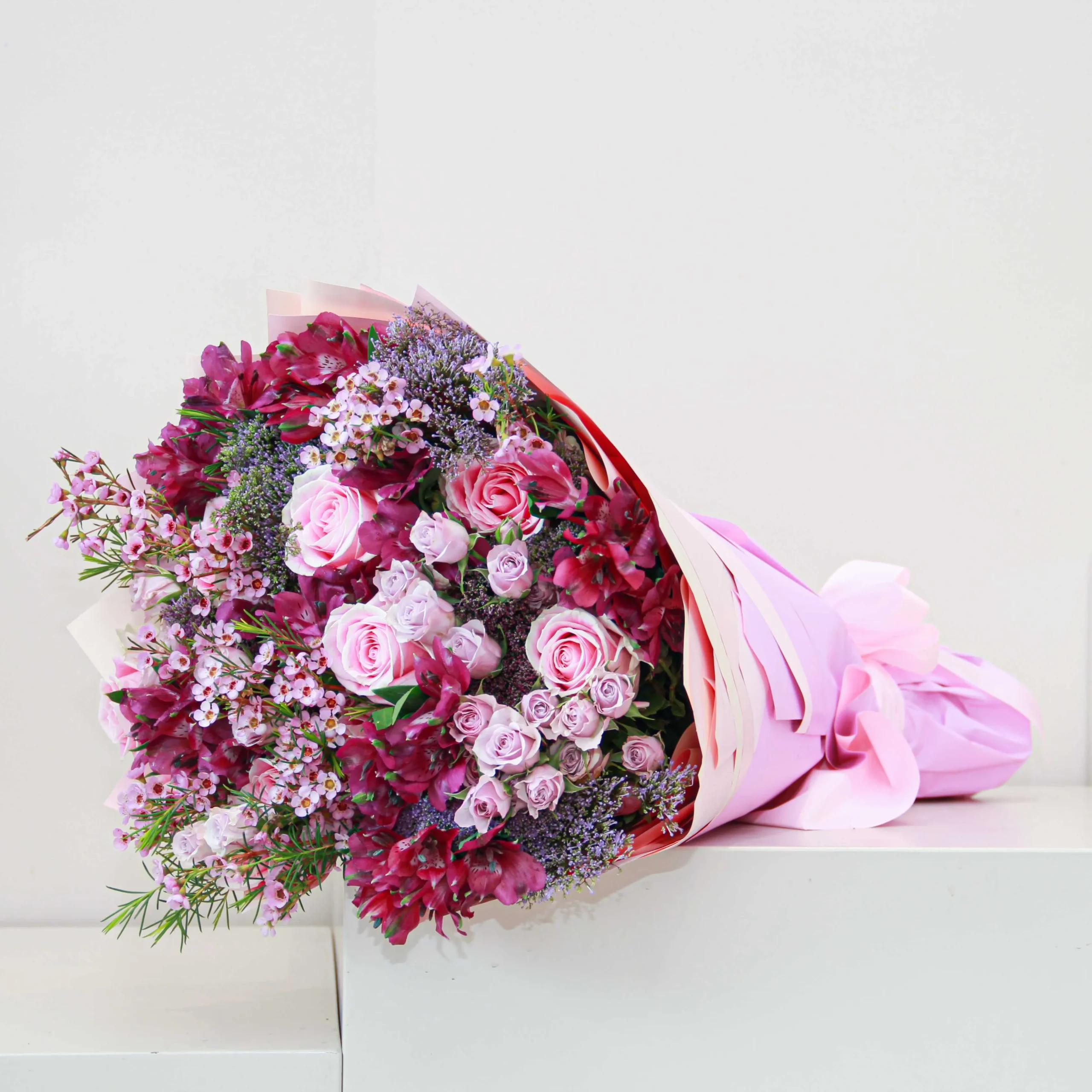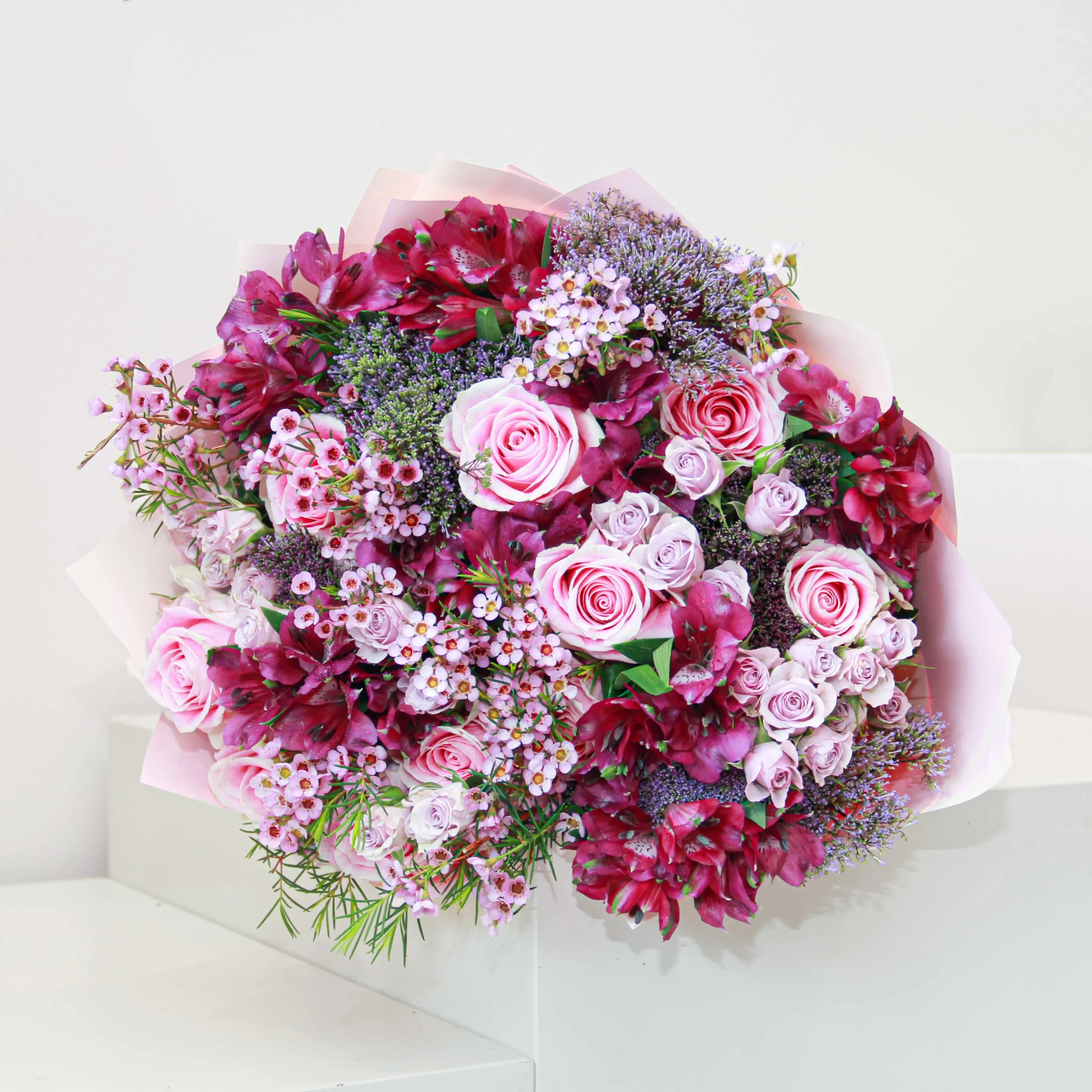 Treat yourself to this gorgeous big bouquet created by our designer right now. pink roses, alstroemeria, spray roses, traselium and Chamelaucium combined.